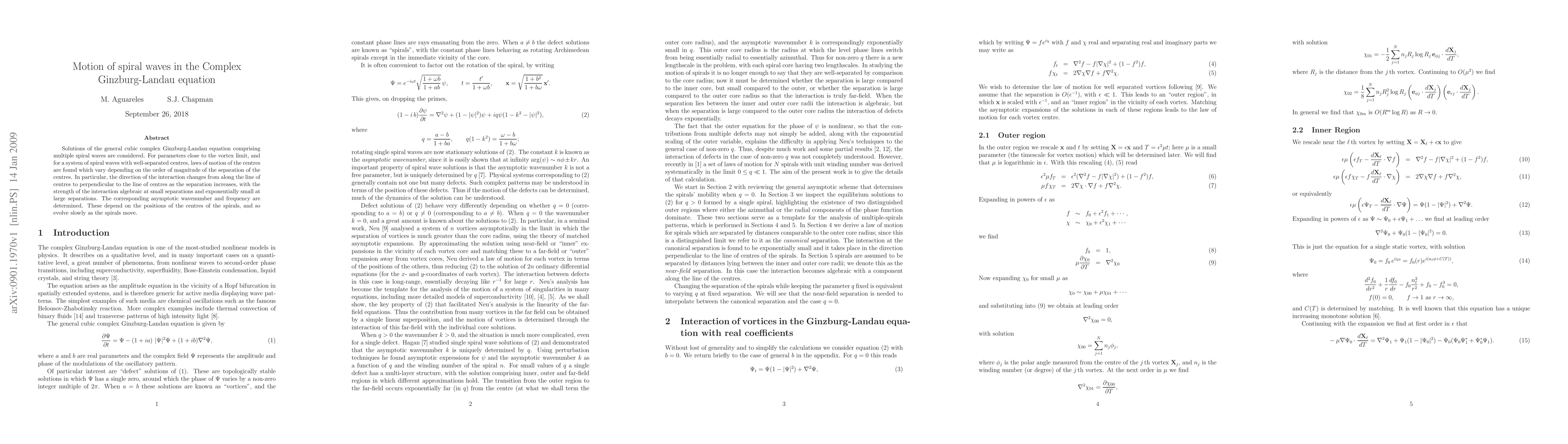 Solutions of the general cubic complex Ginzburg-Landau equation comprising multiple spiral waves are considered. For parameters close to the vortex limit, and for a system of spiral waves with well-separated centres, laws of motion of the centres are found which vary depending on the order of magnitude of the separation of the centres. In particular, the direction of the interaction changes from along the line of centres to perpendicular to the line of centres as the separation increases, with the strength of the interaction algebraic at small separations and exponentially small at large separations. The corresponding asymptotic wavenumber and frequency are determined. These depend on the positions of the centres of the spirals, and so evolve slowly as the spirals move.