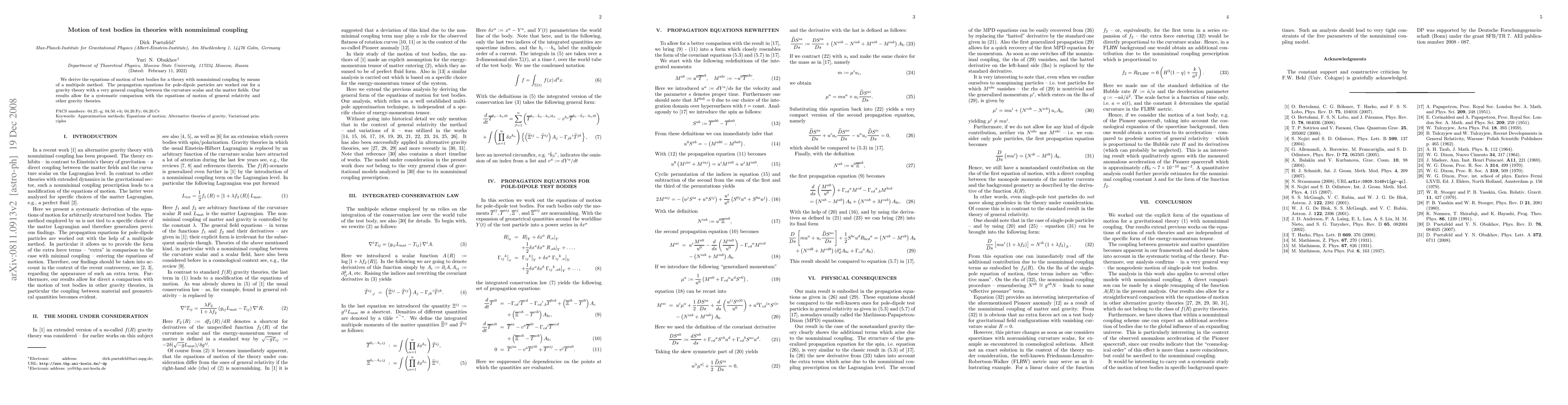 This paper derives the equations of motion for test bodies in a gravity theory featuring nonminimal coupling between the curvature scalar and matter fields, using a multipole method. The results enable systematic comparisons with general relativity and other gravity theories.