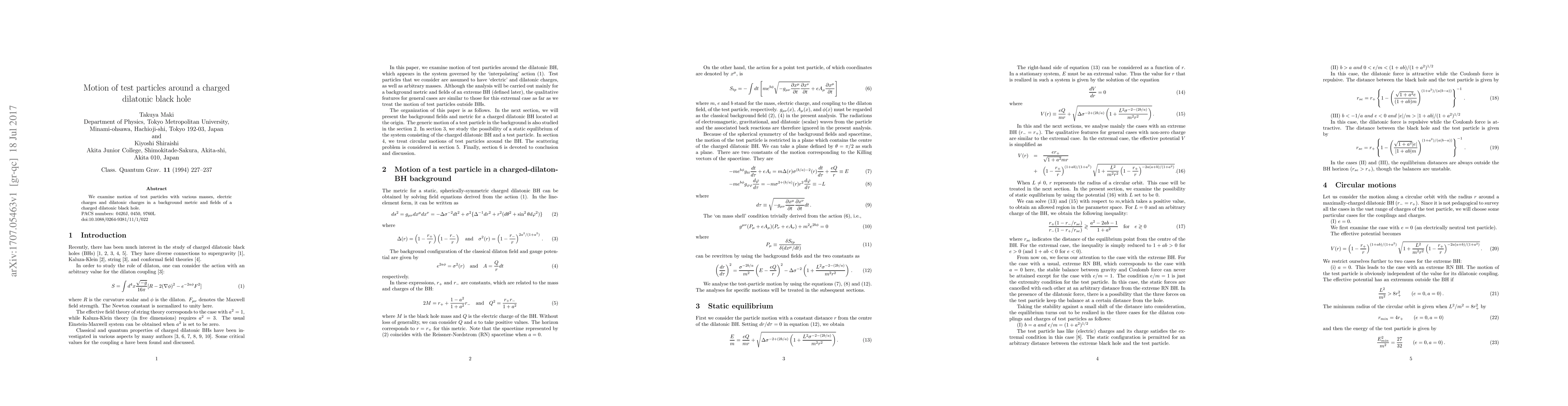 Summary: This study investigates the dynamics of test particles with different masses, electric, and dilatonic charges moving around a charged dilatonic black hole, analyzing their trajectories in the black hole's gravitational and field influence.