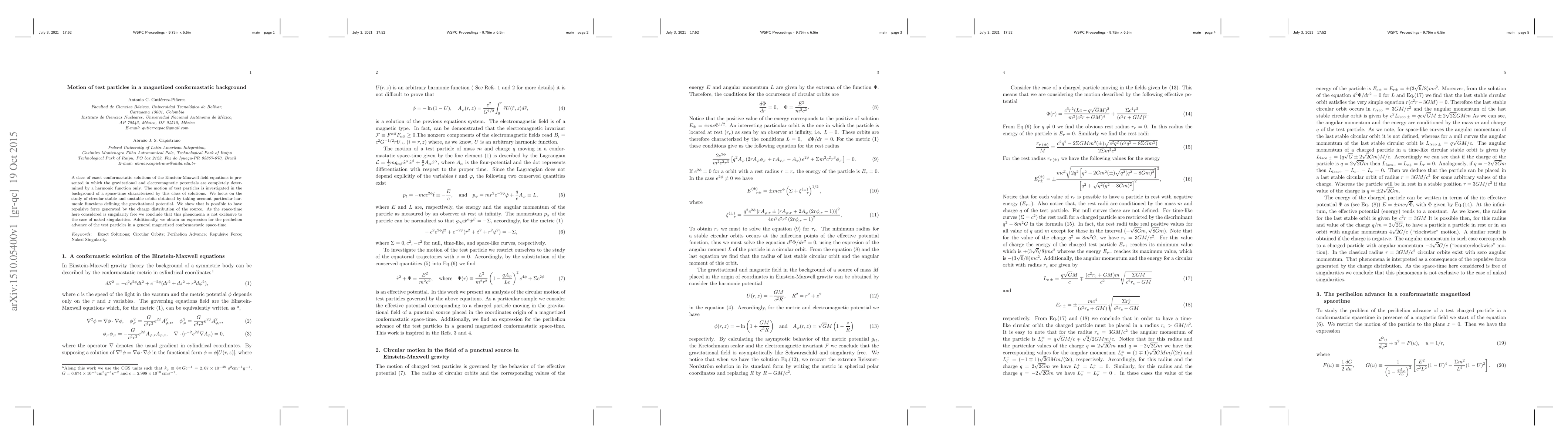 A class of exact conformastatic solutions of the Einstein-Maxwell field equations is presented in which the gravitational and electromagnetic potentials are completely determined by a harmonic function only. The motion of test particles is investigated in the background of a space-time characterized by this class of solutions. We focus on the study of circular stable and unstable orbits obtained by taking account particular harmonic functions defining the gravitational potential. We show that is possible to have repulsive force generated by the charge distribution of the source. As the space-time here considered is singularity free we conclude that this phenomena is not exclusive to the case of naked singularities. Additionally, we obtain an expression for the perihelion advance of the test particles in a general magnetized conformastatic space-time.