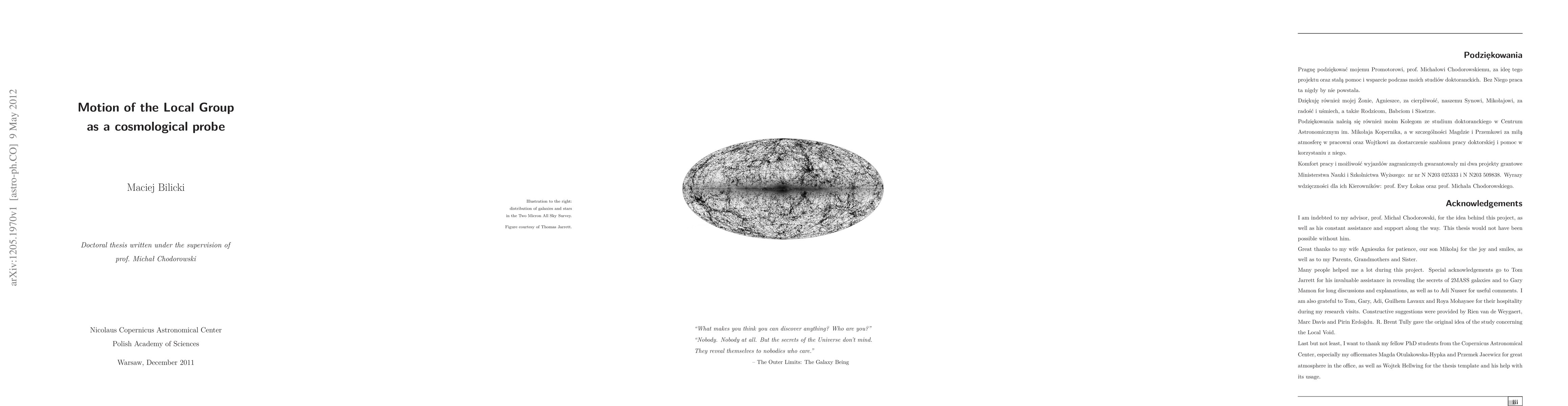 This work stands out by employing the Local Group as a cosmological probe, offering an independent estimation of Omega_m and addressing the influence of nearby structures like the Local Void on dipole measurements.