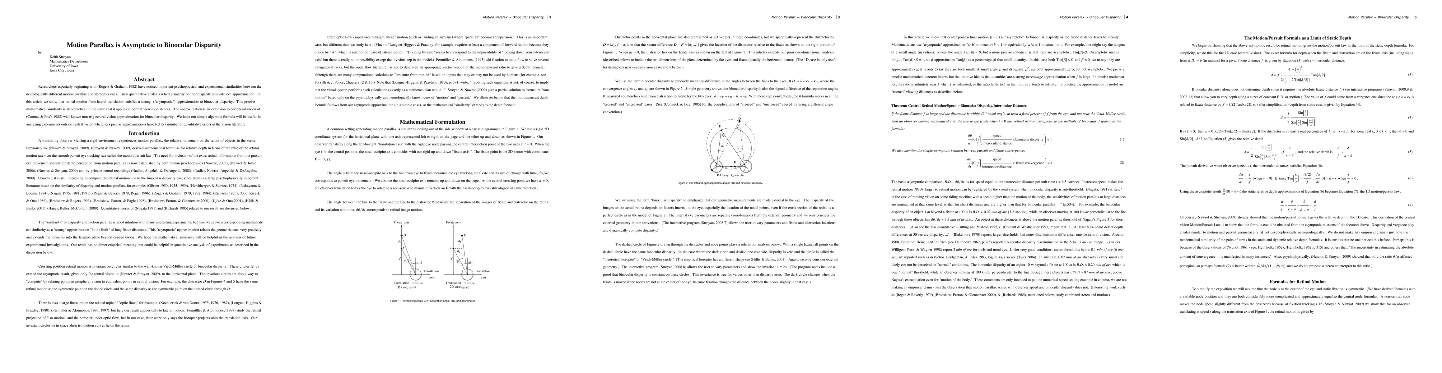 Researchers especially beginning with (Rogers & Graham, 1982) have noticed important psychophysical and experimental similarities between the neurologically different motion parallax and stereopsis cues. Their quantitative analysis relied primarily on the "disparity equivalence" approximation. In this article we show that retinal motion from lateral translation satisfies a strong ("asymptotic") approximation to binocular disparity. This precise mathematical similarity is also practical in the sense that it applies at normal viewing distances. The approximation is an extension to peripheral vision of (Cormac & Fox's 1985) well-known non-trig central vision approximation for binocular disparity. We hope our simple algebraic formula will be useful in analyzing experiments outside central vision where less precise approximations have led to a number of quantitative errors in the vision literature.