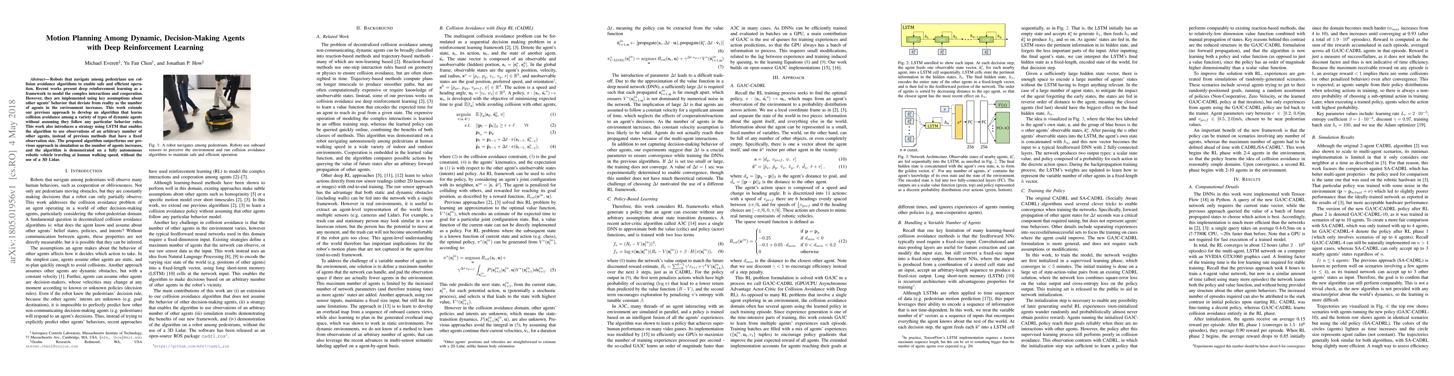 Robots that navigate among pedestrians use collision avoidance algorithms to enable safe and efficient operation. Recent works present deep reinforcement learning as a framework to model the complex interactions and cooperation. However, they are implemented using key assumptions about other agents' behavior that deviate from reality as the number of agents in the environment increases. This work extends our previous approach to develop an algorithm that learns collision avoidance among a variety of types of dynamic agents without assuming they follow any particular behavior rules. This work also introduces a strategy using LSTM that enables the algorithm to use observations of an arbitrary number of other agents, instead of previous methods that have a fixed observation size. The proposed algorithm outperforms our previous approach in simulation as the number of agents increases, and the algorithm is demonstrated on a fully autonomous robotic vehicle traveling at human walking speed, without the use of a 3D Lidar.