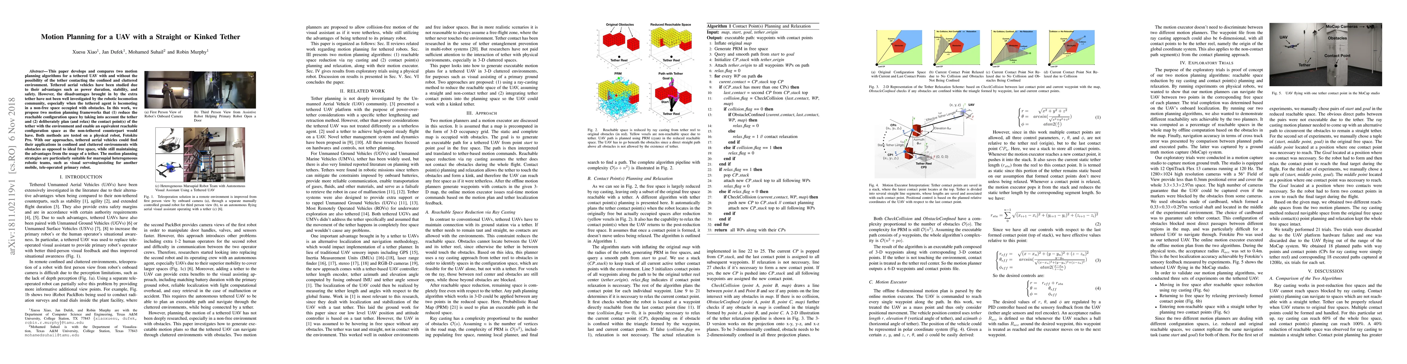 This paper proposes two motion planning algorithms for a tethered UAV navigating confined and cluttered environments, addressing the challenges posed by tether contact with obstacles. The methods enable the UAV to maintain the benefits of tethering while operating in non-free space, demonstrated through testing on a Fotokite Pro.