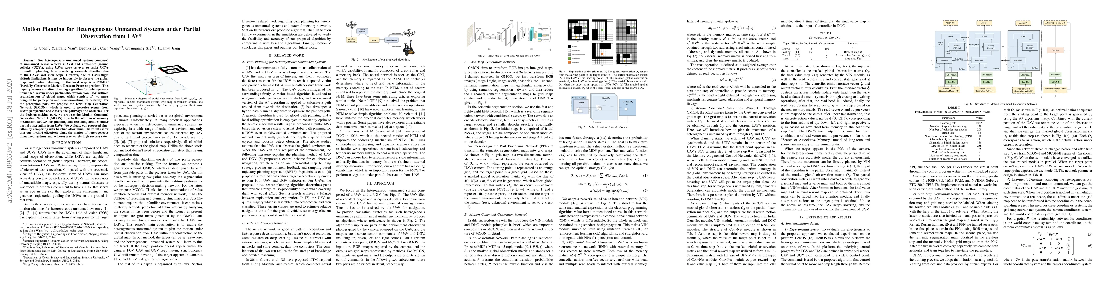This paper proposes a motion planning algorithm for heterogeneous unmanned systems using UAVs to assist UGVs under partial observation, introducing a Grid Map Generation Network for perception and a Motion Command Generation Network with memory for decision-making, achieving effective local motion planning without global map reconstruction.