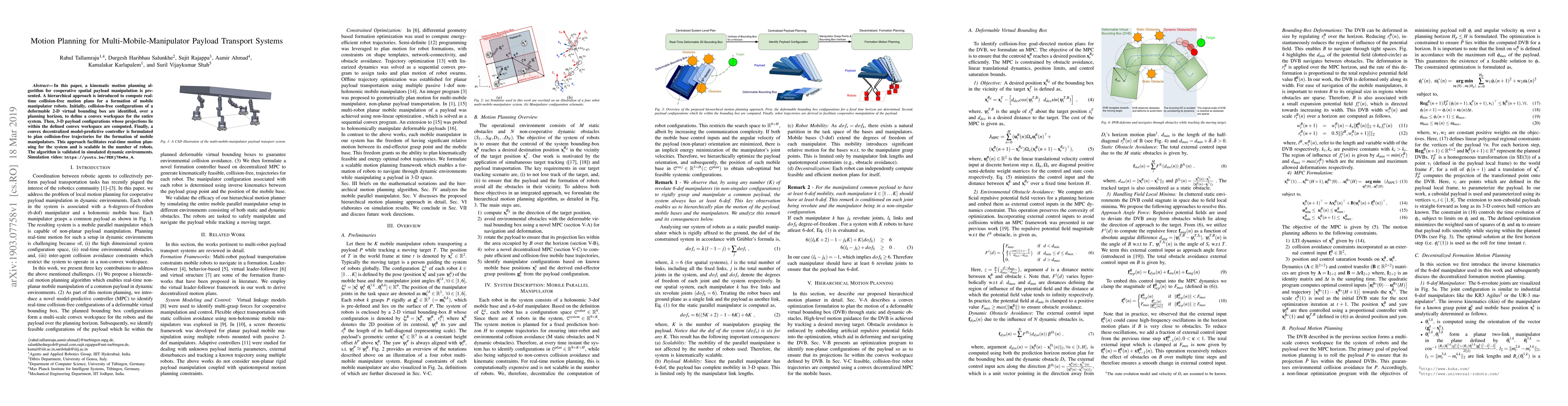 In this paper, a kinematic motion planning algorithm for cooperative spatial payload manipulation is presented. A hierarchical approach is introduced to compute real-time collision-free motion plans for a formation of mobile manipulator robots. Initially, collision-free configurations of a deformable 2-D virtual bounding box are identified, over a planning horizon, to define a convex workspace for the entire system. Then, 3-D payload configurations whose projections lie within the defined convex workspace are computed. Finally, a convex decentralized model-predictive controller is formulated to plan collision-free trajectories for the formation of mobile manipulators. This approach facilitates real-time motion planning for the system and is scalable in the number of robots. The algorithm is validated in simulated dynamic environments. Simulation video: https://youtu.be/9EKj7RwRs_4.