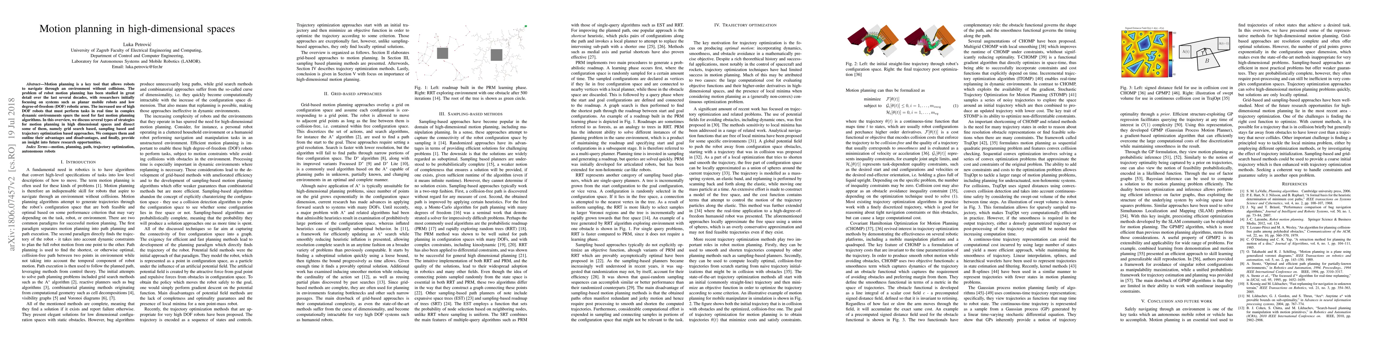 Motion planning is a key tool that allows robots to navigate through an environment without collisions. The problem of robot motion planning has been studied in great detail over the last several decades, with researchers initially focusing on systems such as planar mobile robots and low degree-of-freedom (DOF) robotic arms. The increased use of high DOF robots that must perform tasks in real time in complex dynamic environments spurs the need for fast motion planning algorithms. In this overview, we discuss several types of strategies for motion planning in high dimensional spaces and dissect some of them, namely grid search based, sampling based and trajectory optimization based approaches. We compare them and outline their advantages and disadvantages, and finally, provide an insight into future research opportunities.