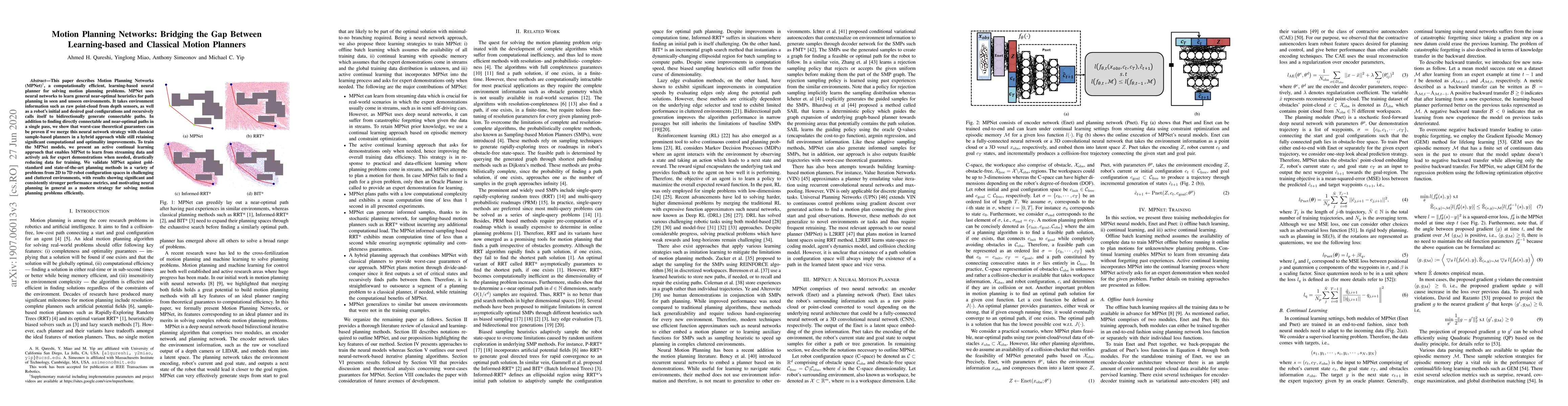 This paper introduces Motion Planning Networks (MPNet), a learning-based neural planner that efficiently solves motion planning problems by learning near-optimal heuristics. It combines neural networks with classical sample-based planners for improved performance and theoretical guarantees.