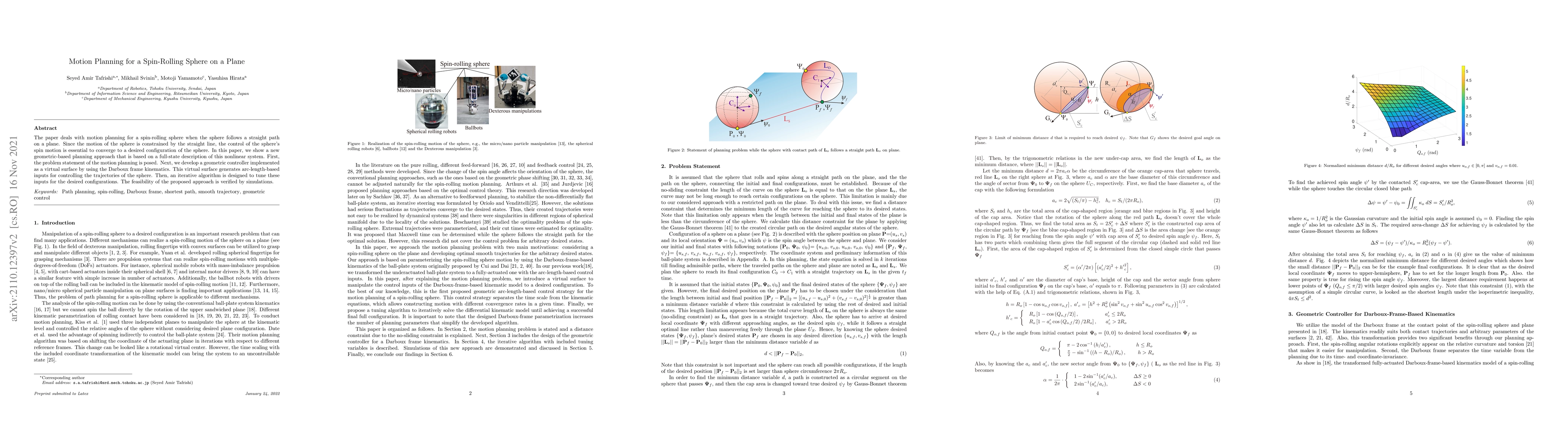 The paper presents a geometric-based planning approach for motion planning of a spin-rolling sphere on a straight path, utilizing a full-state description of the nonlinear system and a virtual surface based on Darboux frame kinematics to generate arc-length-based inputs for trajectory control.
