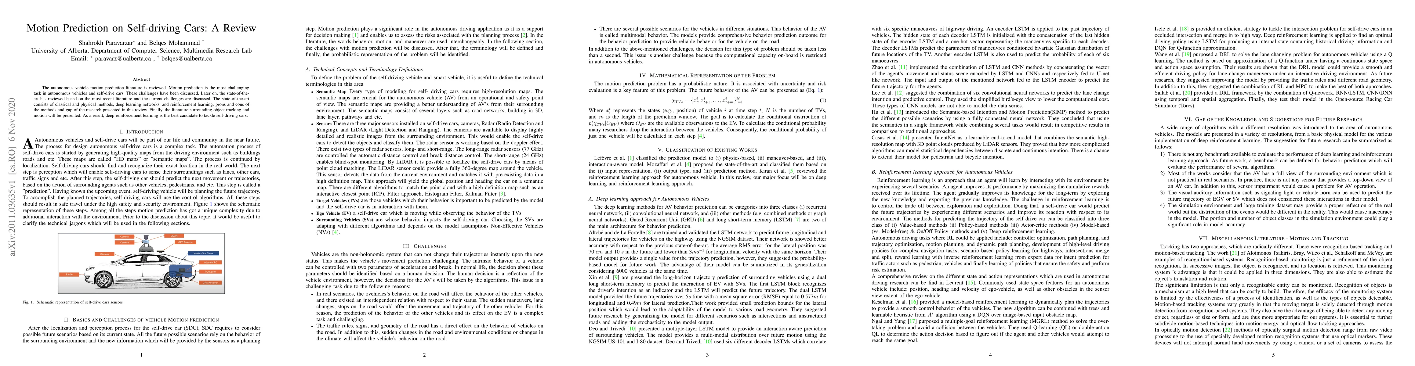 The autonomous vehicle motion prediction literature is reviewed. Motion prediction is the most challenging task in autonomous vehicles and self-drive cars. These challenges have been discussed. Later on, the state-of-theart has reviewed based on the most recent literature and the current challenges are discussed. The state-of-the-art consists of classical and physical methods, deep learning networks, and reinforcement learning. prons and cons of the methods and gap of the research presented in this review. Finally, the literature surrounding object tracking and motion will be presented. As a result, deep reinforcement learning is the best candidate to tackle self-driving cars.