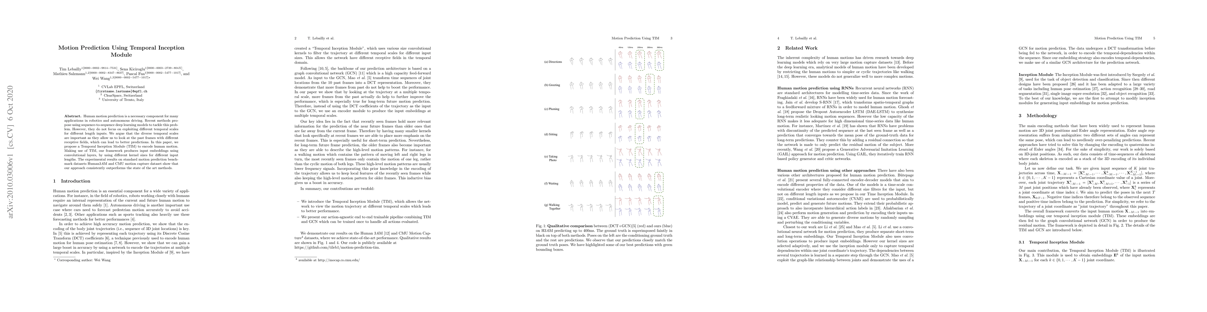 Human motion prediction is a necessary component for many applications in robotics and autonomous driving. Recent methods propose using sequence-to-sequence deep learning models to tackle this problem. However, they do not focus on exploiting different temporal scales for different length inputs. We argue that the diverse temporal scales are important as they allow us to look at the past frames with different receptive fields, which can lead to better predictions. In this paper, we propose a Temporal Inception Module (TIM) to encode human motion. Making use of TIM, our framework produces input embeddings using convolutional layers, by using different kernel sizes for different input lengths. The experimental results on standard motion prediction benchmark datasets Human3.6M and CMU motion capture dataset show that our approach consistently outperforms the state of the art methods.