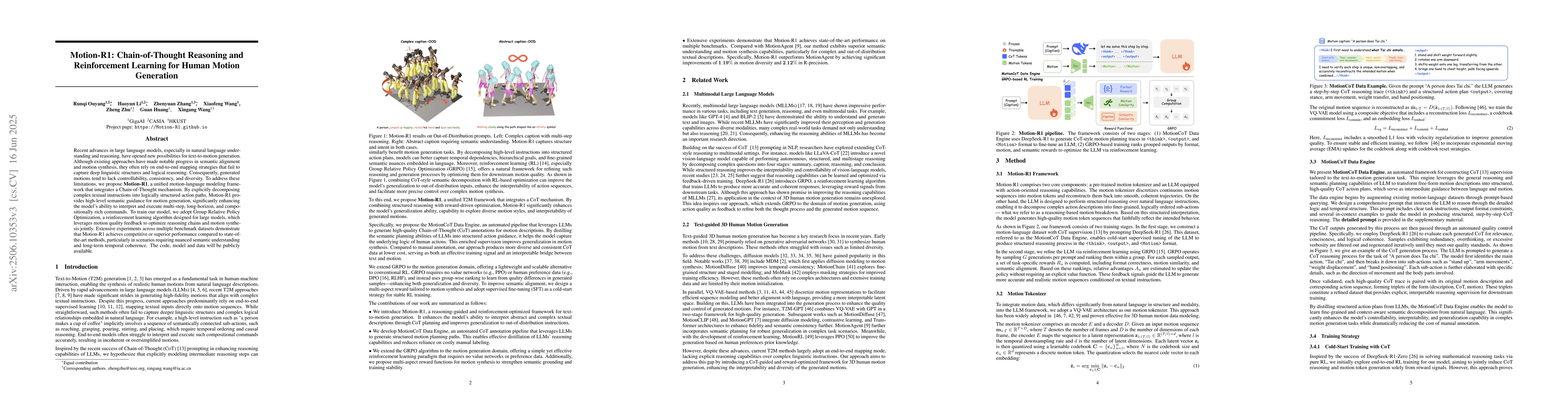 Motion-R1 improves human motion generation by integrating Chain-of-Thought reasoning and reinforcement learning to capture complex linguistic structures and logical reasoning.
