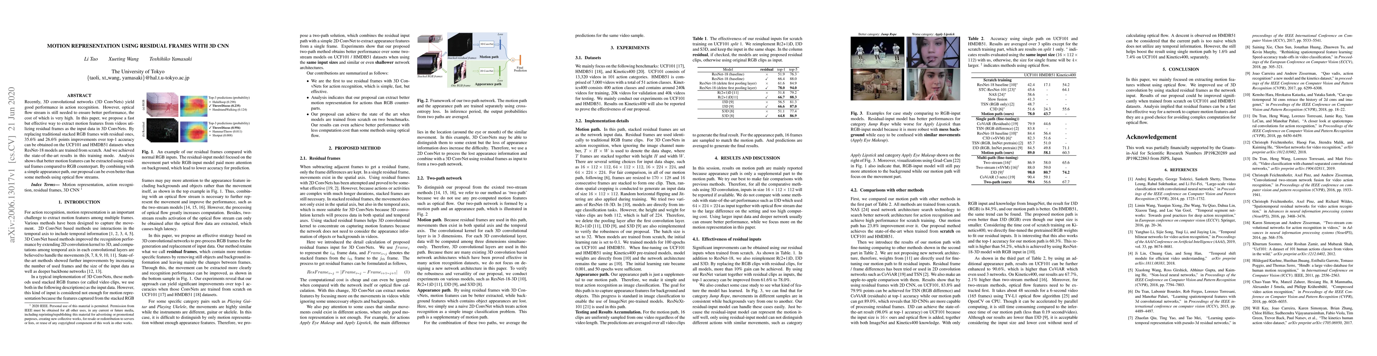 This research paper proposes a novel method to enhance motion representation in videos using residual frames as input data for 3D convolutional networks (3D ConvNets). The approach achieves significant improvements in action recognition accuracy on UCF101 and HMDB51 datasets, demonstrating the effectiveness of residual frames over traditional RGB frames, and achieving state-of-the-art results in training mode.