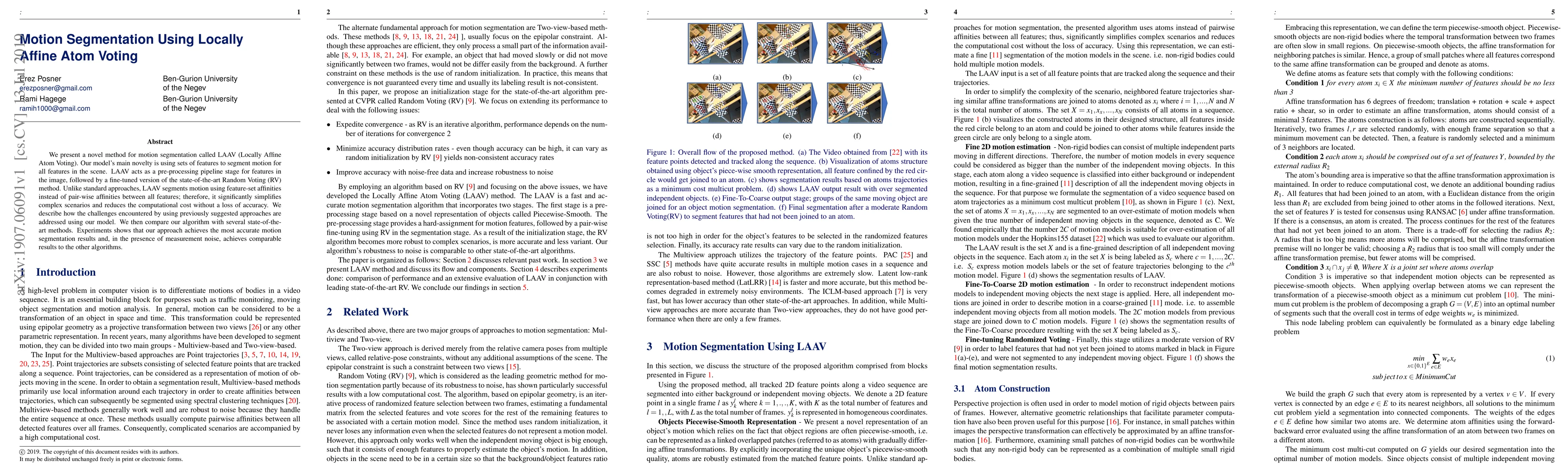 The paper introduces LAAV, a novel motion segmentation method that uses locally affine atom voting to segment motion based on feature-set affinities, simplifying complex scenarios and reducing computational costs. LAAV compares favorably to state-of-the-art methods, achieving high accuracy and robustness in noisy conditions.