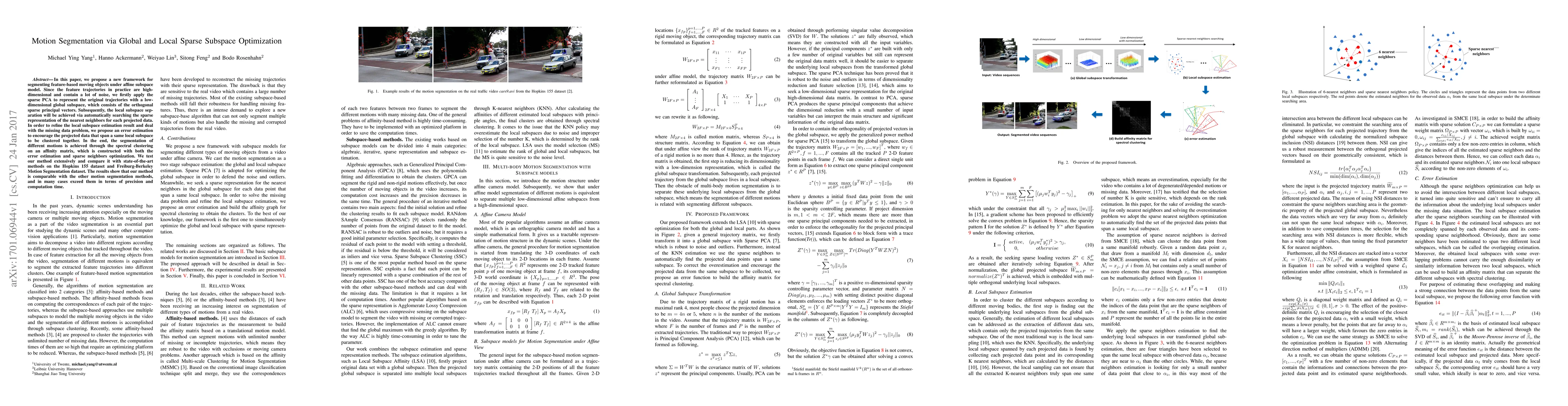 In this paper, we propose a new framework for segmenting feature-based moving objects under affine subspace model. Since the feature trajectories in practice are high-dimensional and contain a lot of noise, we firstly apply the sparse PCA to represent the original trajectories with a low-dimensional global subspace, which consists of the orthogonal sparse principal vectors. Subsequently, the local subspace separation will be achieved via automatically searching the sparse representation of the nearest neighbors for each projected data. In order to refine the local subspace estimation result and deal with the missing data problem, we propose an error estimation to encourage the projected data that span a same local subspace to be clustered together. In the end, the segmentation of different motions is achieved through the spectral clustering on an affinity matrix, which is constructed with both the error estimation and sparse neighbors optimization. We test our method extensively and compare it with state-of-the-art methods on the Hopkins 155 dataset and Freiburg-Berkeley Motion Segmentation dataset. The results show that our method is comparable with the other motion segmentation methods, and in many cases exceed them in terms of precision and computation time.