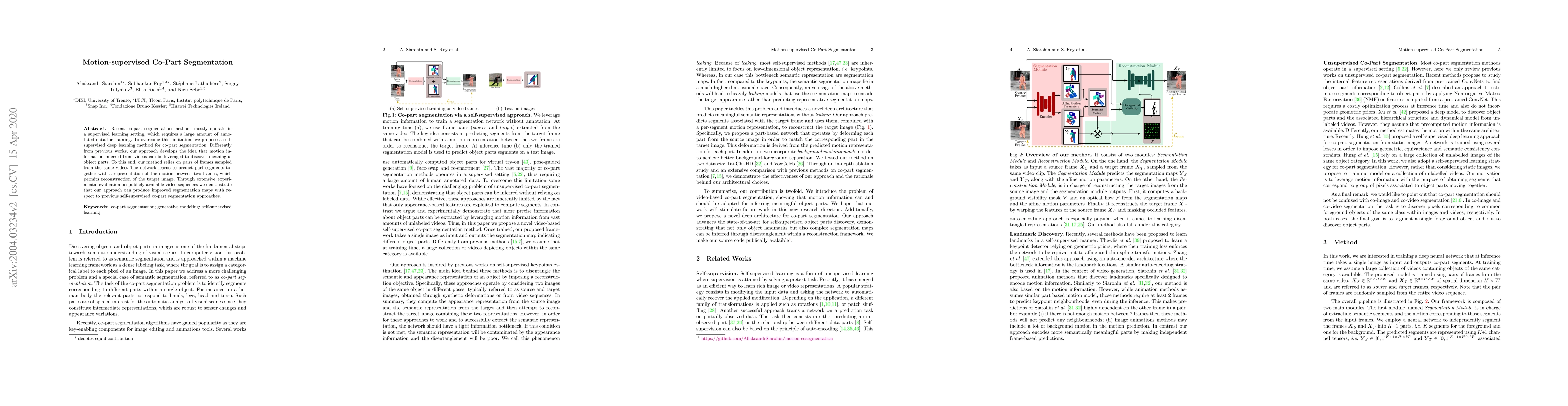 This paper introduces a self-supervised deep learning method for co-part segmentation using motion information from video frames, eliminating the need for large annotated datasets. The proposed network predicts part segments and motion representations, achieving better segmentation results compared to previous self-supervised methods.