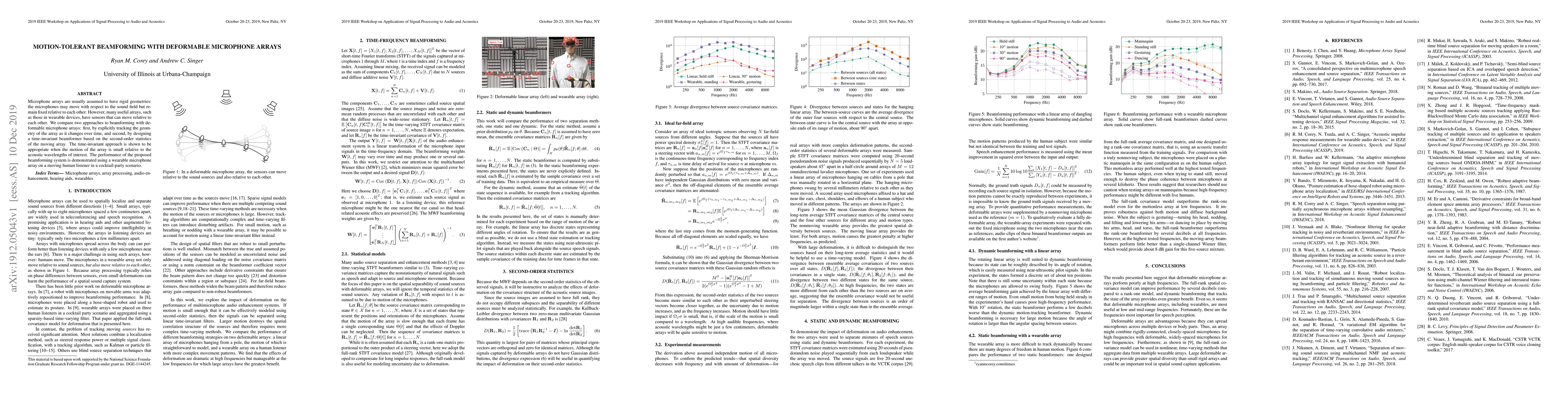 This paper explores beamforming techniques for deformable microphone arrays, comparing explicit geometry tracking and a time-invariant approach based on second-order statistics. The time-invariant method is effective for small array motions relative to acoustic wavelengths, as demonstrated in a wearable device during a cocktail-party scenario.