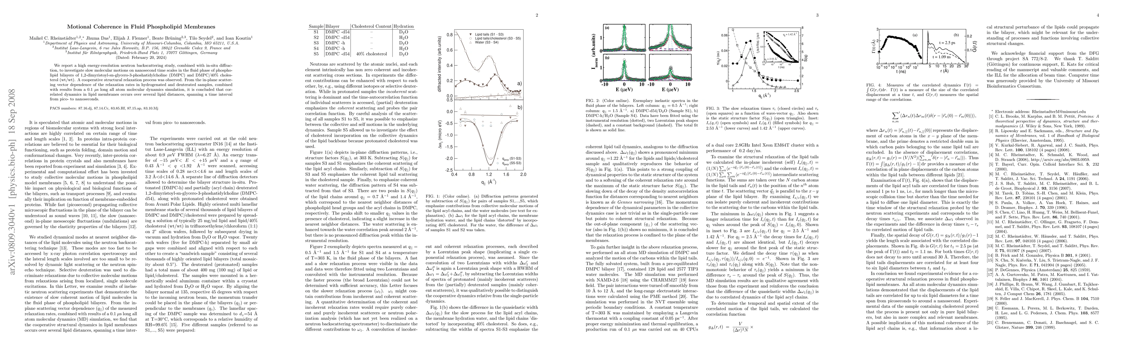 This study uses neutron backscattering and diffraction to examine slow molecular motions in phospholipid bilayers, revealing a cooperative structural relaxation process. The findings suggest that correlated dynamics in lipid membranes extend across multiple lipid distances and occur over a broad time scale from picoseconds to nanoseconds.