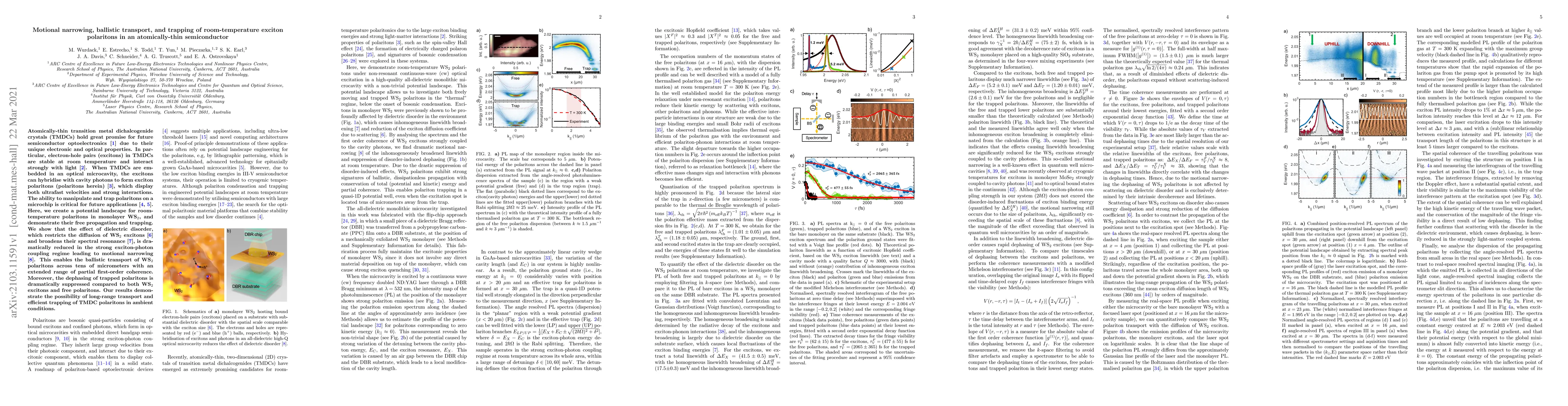 Atomically-thin transition metal dichalcogenide crystals (TMDCs) hold great promise for future semiconductor optoelectronics due to their unique electronic and optical properties. In particular, electron-hole pairs (excitons) in TMDCs are stable at room temperature and interact strongly with light. When TMDCs are embedded in an optical microcavity, the excitons can hybridise with cavity photons to form exciton polaritons (polaritons herein), which display both ultrafast velocities and strong interactions. The ability to manipulate and trap polaritons on a microchip is critical for future applications. Here, we create a potential landscape for room-temperature polaritons in monolayer WS$_2$, and demonstrate their free propagation and trapping. We show that the effect of dielectric disorder, which restricts the diffusion of WS$_2$ excitons and broadens their spectral resonance, is dramatically reduced in the strong exciton-photon coupling regime leading to motional narrowing. This enables the ballistic transport of WS$_2$ polaritons across tens of micrometers with an extended range of partial first-order coherence. Moreover, the dephasing of trapped polaritons is dramatically suppressed compared to both WS$_2$ excitons and free polaritons. Our results demonstrate the possibility of long-range transport and efficient trapping of TMDC polaritons in ambient conditions.