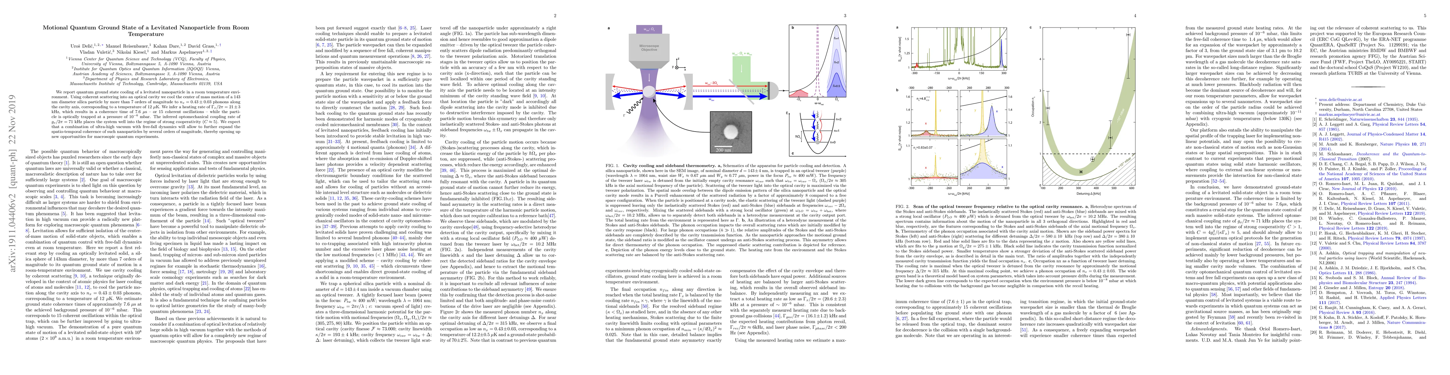 This paper reports achieving quantum ground state cooling of a levitated nanoparticle at room temperature, reducing its center of mass motion phonons by over 7 orders of magnitude to 12 μK. The study demonstrates strong cooperativity and suggests potential for further coherence enhancement with ultra-high vacuum and free-fall dynamics.