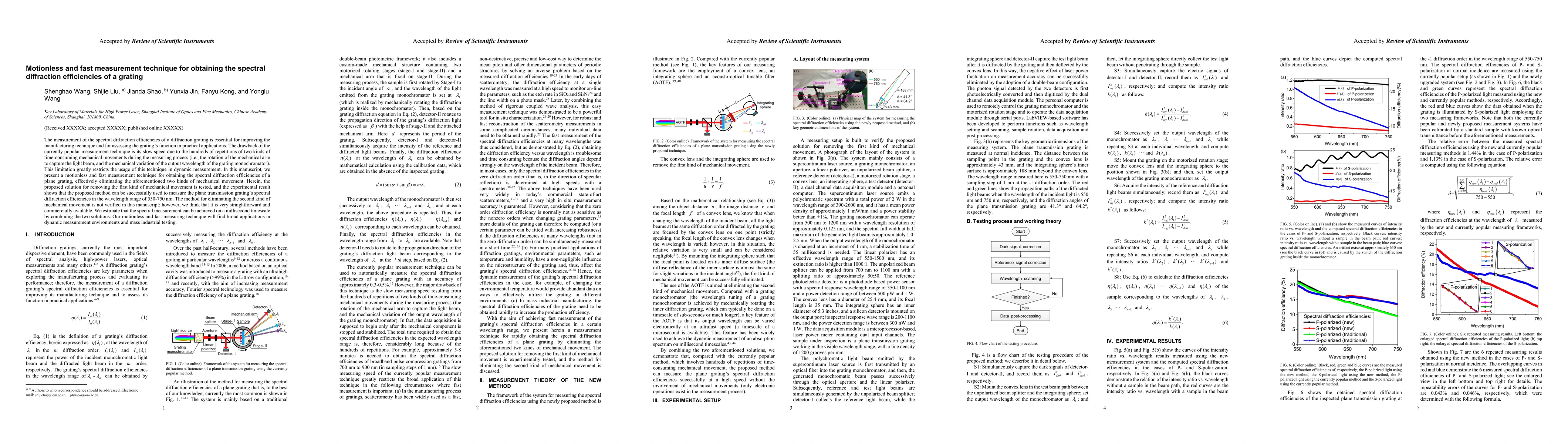 The measurement of the spectral diffraction efficiencies of a diffraction grating is essential for improving the manufacturing technique and for assessing the grating's function in practical applications. The drawback of the currently popular measurement technique is its slow speed due to the hundreds of repetitions of two kinds of time-consuming mechanical movements during the measuring process (i.e., the rotation of the mechanical arm to capture the light beam, and the mechanical variation of the output wavelength of the grating monochromator). This limitation greatly restricts the usage of this technique in dynamic measurement. In this manuscript, we present a motionless and fast measurement technique for obtaining the spectral diffraction efficiencies of a plane grating, effectively eliminating the aforementioned two kinds of mechanical movement. Herein, the proposed solution for removing the first kind of mechanical movement is tested, and the experimental result shows that the proposed method can be successfully used to measure the plane transmission grating's spectral diffraction efficiencies in the wavelength range of 550-750 nm. The method for eliminating the second kind of mechanical movement is not verified in this manuscript; however, we think that it is very straightforward and commercially available. We estimate that the spectral measurement can be achieved on a millisecond timescale by combining the two solutions. Our motionless and fast measuring technique will find broad applications in dynamic measurement environments and mass industrial testing.