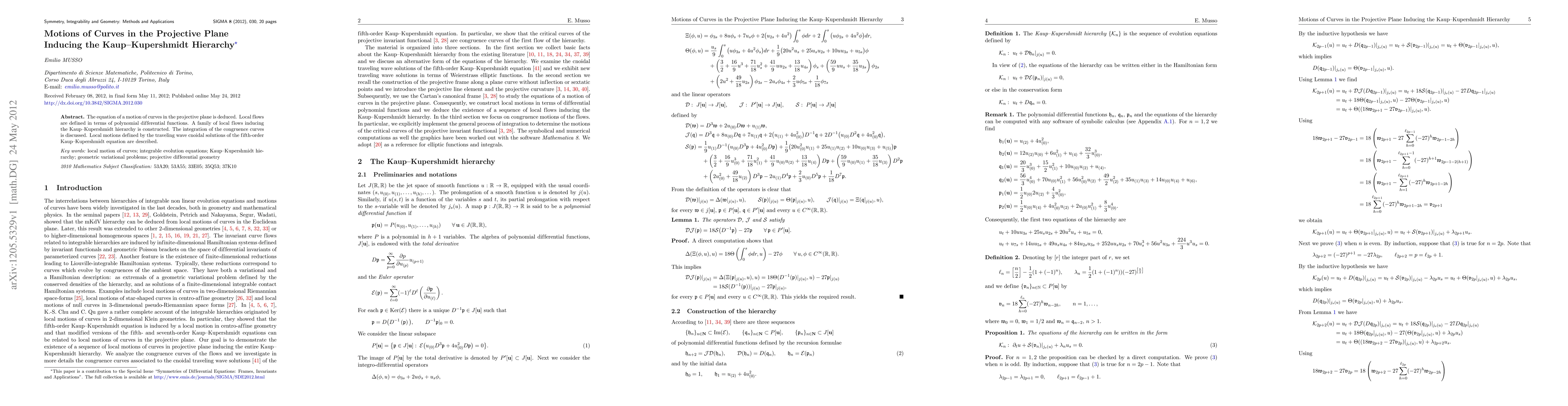 This paper deduces the equation of curve motions in the projective plane and constructs local flows inducing the Kaup-Kupershmidt hierarchy, discussing the integration of congruence curves and local motions defined by cnoidal solutions.