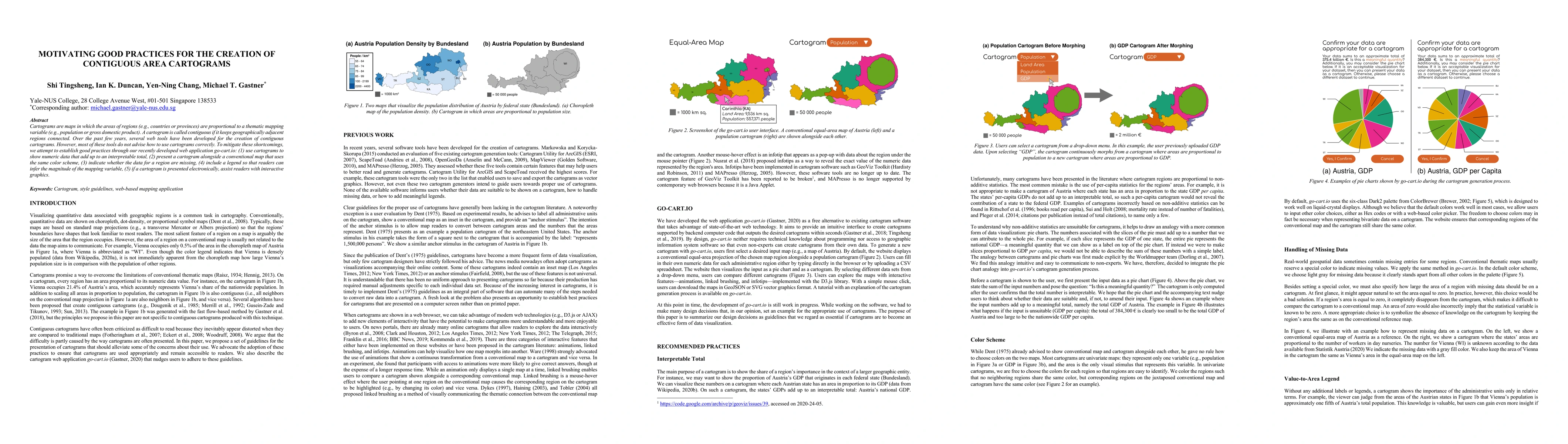 This paper proposes good practices for creating contiguous area cartograms, emphasizing the use of cartograms for additive numeric data, presenting them alongside conventional maps, indicating missing data, including legends, and providing interactive graphics for electronic presentations. The recommendations are demonstrated through the web application go-cart.io.