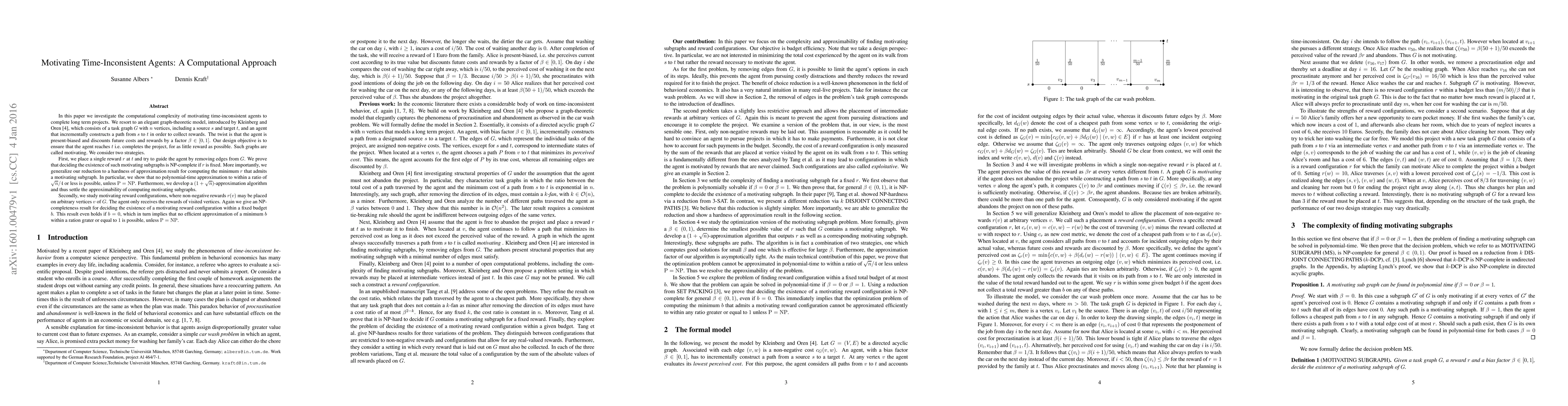 In this paper we investigate the computational complexity of motivating time-inconsistent agents to complete long term projects. We resort to an elegant graph-theoretic model, introduced by Kleinberg and Oren, which consists of a task graph $G$ with $n$ vertices, including a source $s$ and target $t$, and an agent that incrementally constructs a path from $s$ to $t$ in order to collect rewards. The twist is that the agent is present-biased and discounts future costs and rewards by a factor $\beta\in [0,1]$. Our design objective is to ensure that the agent reaches $t$ i.e.\ completes the project, for as little reward as possible. Such graphs are called motivating. We consider two strategies. First, we place a single reward $r$ at $t$ and try to guide the agent by removing edges from $G$. We prove that deciding the existence of such motivating subgraphs is NP-complete if $r$ is fixed. More importantly, we generalize our reduction to a hardness of approximation result for computing the minimum $r$ that admits a motivating subgraph. In particular, we show that no polynomial-time approximation to within a ratio of $\sqrt{n}/4$ or less is possible, unless ${\rm P}={\rm NP}$. Furthermore, we develop a $(1+\sqrt{n})$-approximation algorithm and thus settle the approximability of computing motivating subgraphs. Secondly, we study motivating reward configurations, where non-negative rewards $r(v)$ may be placed on arbitrary vertices $v$ of $G$. The agent only receives the rewards of visited vertices. Again we give an NP-completeness result for deciding the existence of a motivating reward configuration within a fixed budget $b$. This result even holds if $b=0$, which in turn implies that no efficient approximation of a minimum $b$ within a ration grater or equal to $1$ is possible, unless ${\rm P}={\rm NP}$.