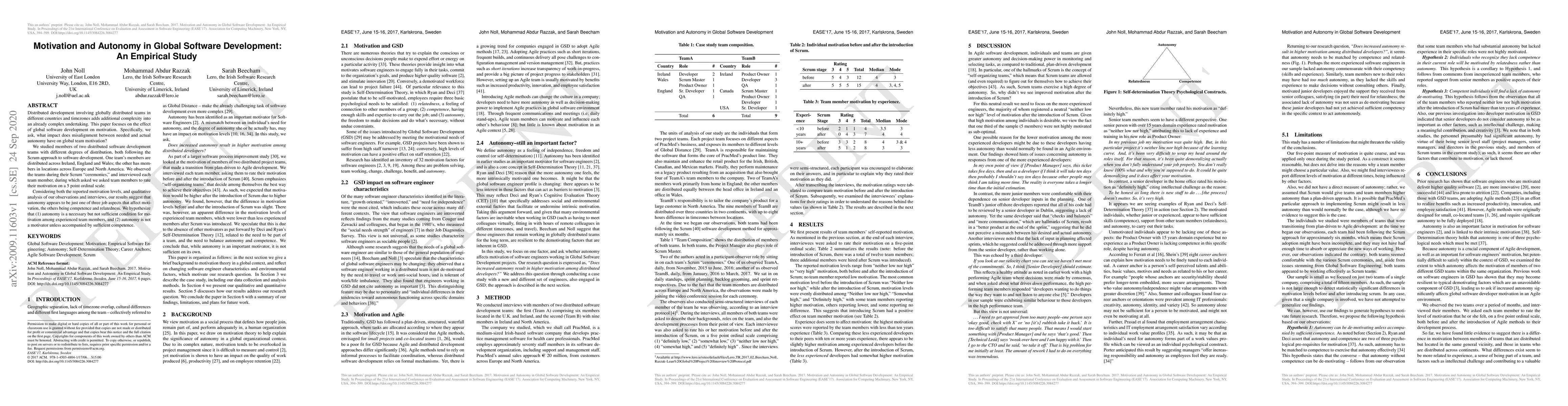 This study investigates the impact of autonomy on motivation in globally distributed software development teams using Scrum. Findings suggest that while autonomy is important, it is not the sole factor influencing motivation; competence and relatedness are equally crucial. The research concludes that autonomy alone is insufficient for high motivation unless paired with adequate competence.