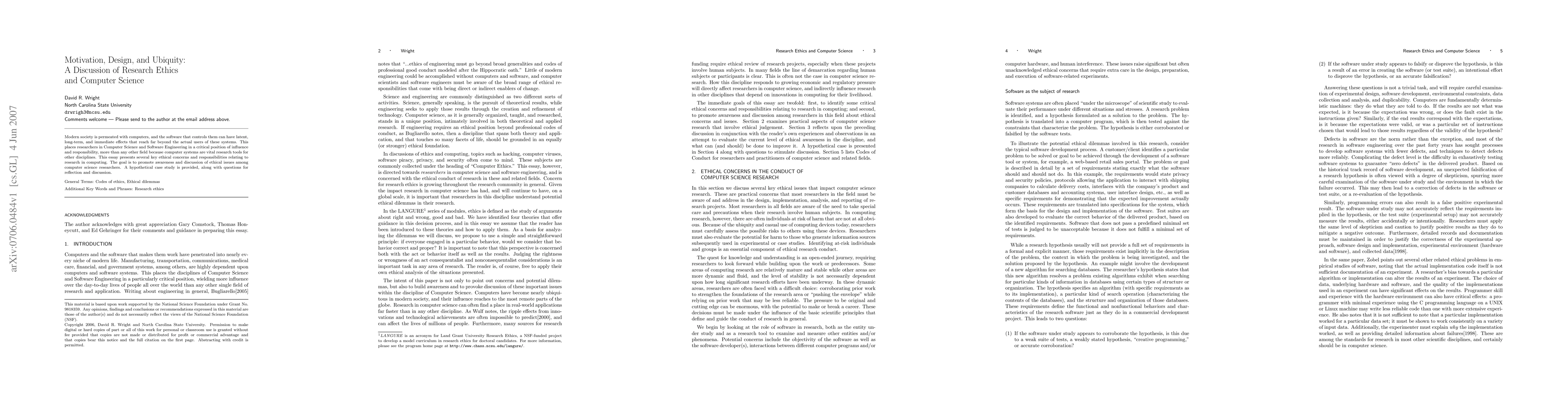 Modern society is permeated with computers, and the software that controls them can have latent, long-term, and immediate effects that reach far beyond the actual users of these systems. This places researchers in Computer Science and Software Engineering in a critical position of influence and responsibility, more than any other field because computer systems are vital research tools for other disciplines. This essay presents several key ethical concerns and responsibilities relating to research in computing. The goal is to promote awareness and discussion of ethical issues among computer science researchers. A hypothetical case study is provided, along with questions for reflection and discussion.