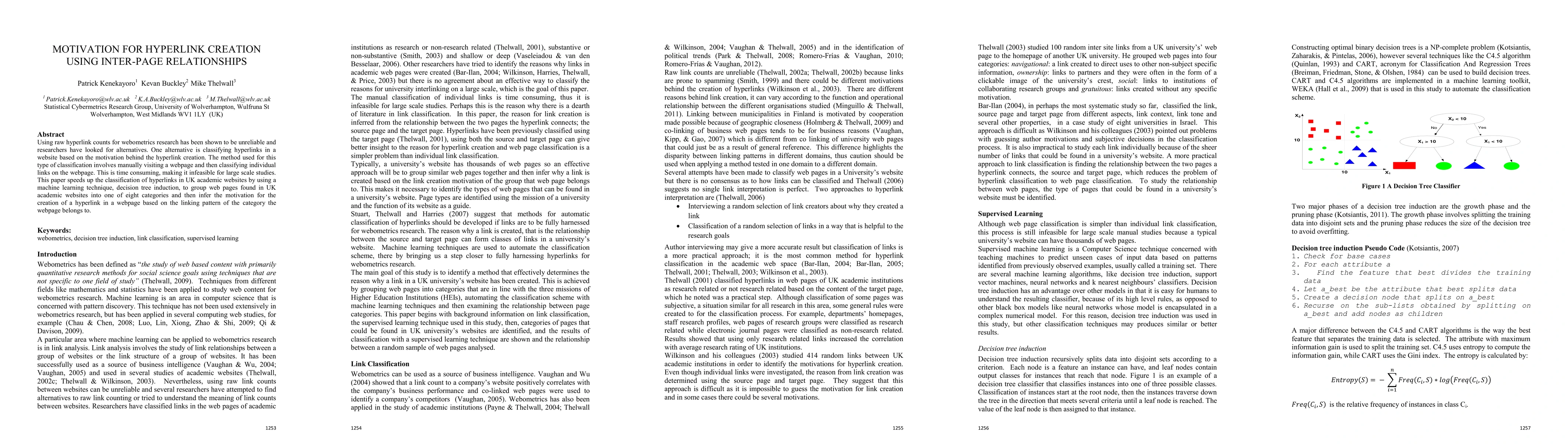 Using raw hyperlink counts for webometrics research has been shown to be unreliable and researchers have looked for alternatives. One alternative is classifying hyperlinks in a website based on the motivation behind the hyperlink creation. The method used for this type of classification involves manually visiting a webpage and then classifying individual links on the webpage. This is time consuming, making it infeasible for large scale studies. This paper speeds up the classification of hyperlinks in UK academic websites by using a machine learning technique, decision tree induction, to group web pages found in UK academic websites into one of eight categories and then infer the motivation for the creation of a hyperlink in a webpage based on the linking pattern of the category the webpage belongs to.
