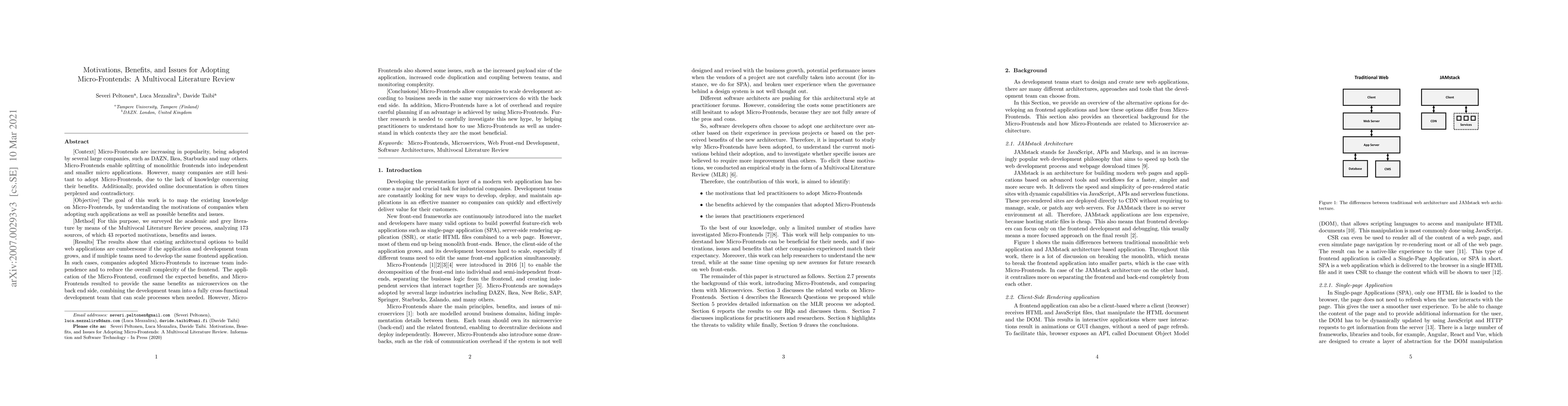 This paper conducts a multivocal literature review to explore motivations, benefits, and issues for adopting Micro-Frontends. It finds that while Micro-Frontends enable scalable, team-based development similar to microservices, they also introduce challenges like increased payload size, code duplication, and monitoring complexity.