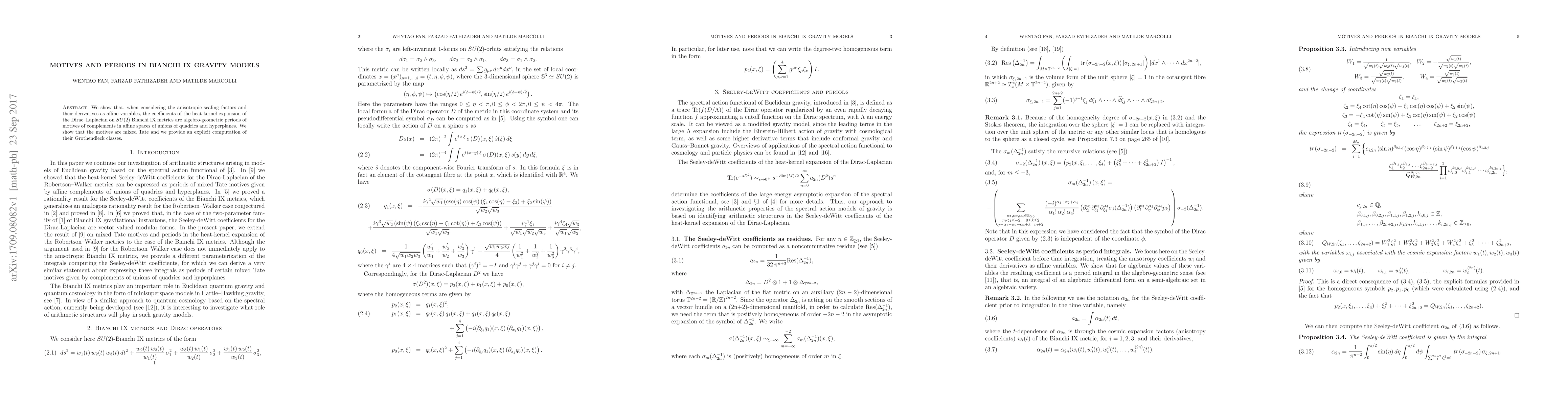 This paper demonstrates that the coefficients in the heat kernel expansion of the Dirac-Laplacian on Bianchi IX metrics can be interpreted as algebro-geometric periods of mixed Tate motives derived from affine spaces of quadrics and hyperplanes, with explicit computation of their Grothendieck classes.
