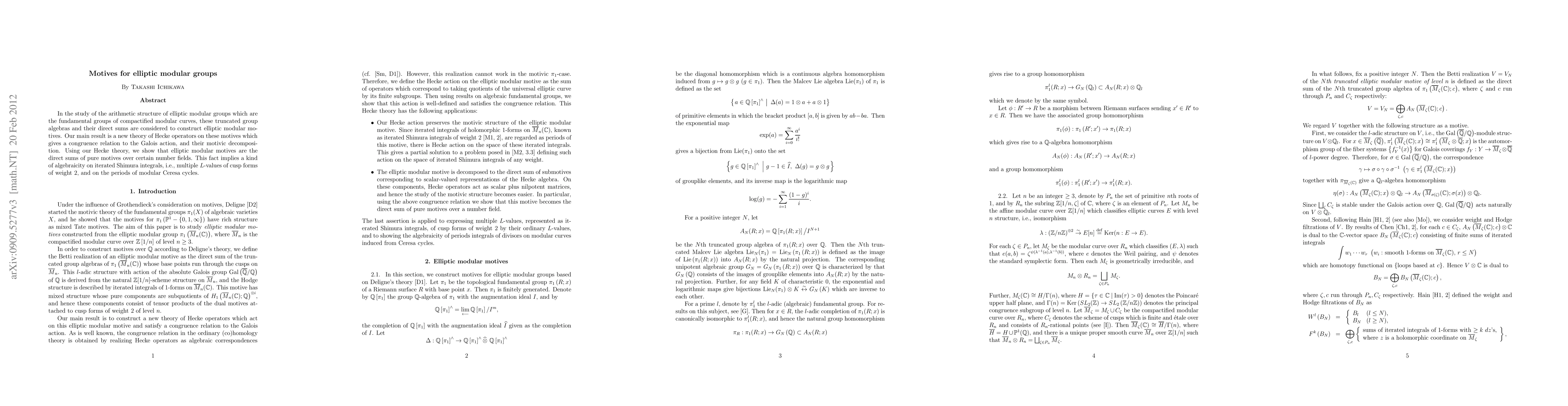 The paper develops a new theory of Hecke operators for elliptic modular motives derived from truncated group algebras of elliptic modular groups, establishing a congruence relation and motivic decomposition. It concludes that these motives are direct sums of pure motives, implying algebraicity for iterated Shimura integrals and modular Ceresa cycles.