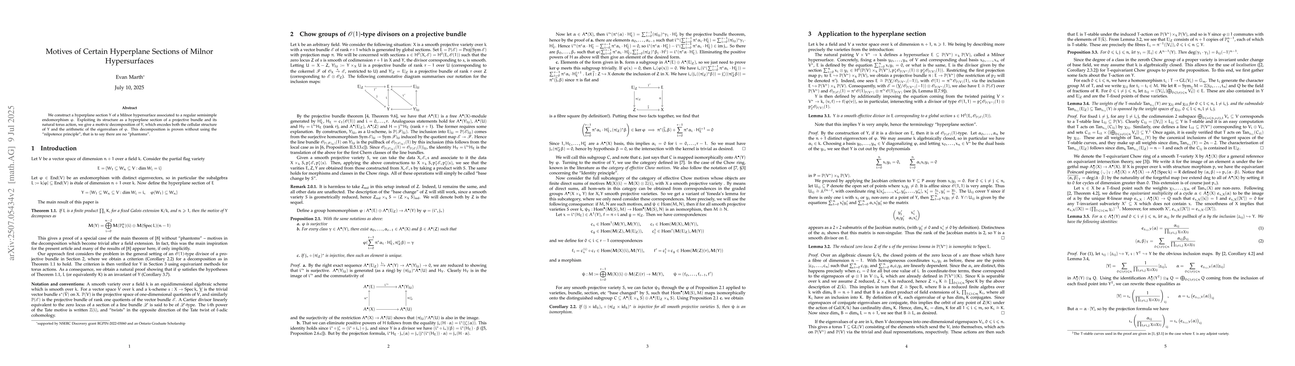 The research constructs a hyperplane section Y of a Milnor hypersurface associated with a regular semisimple endomorphism φ, exploiting its structure as a hyperplane section of a projective bundle and its natural torus action to give a motivic decomposition of Y, encoding both the cellular structure of Y and the arithmetic of the eigenvalues of φ, without relying on the 'nilpotence principle'.