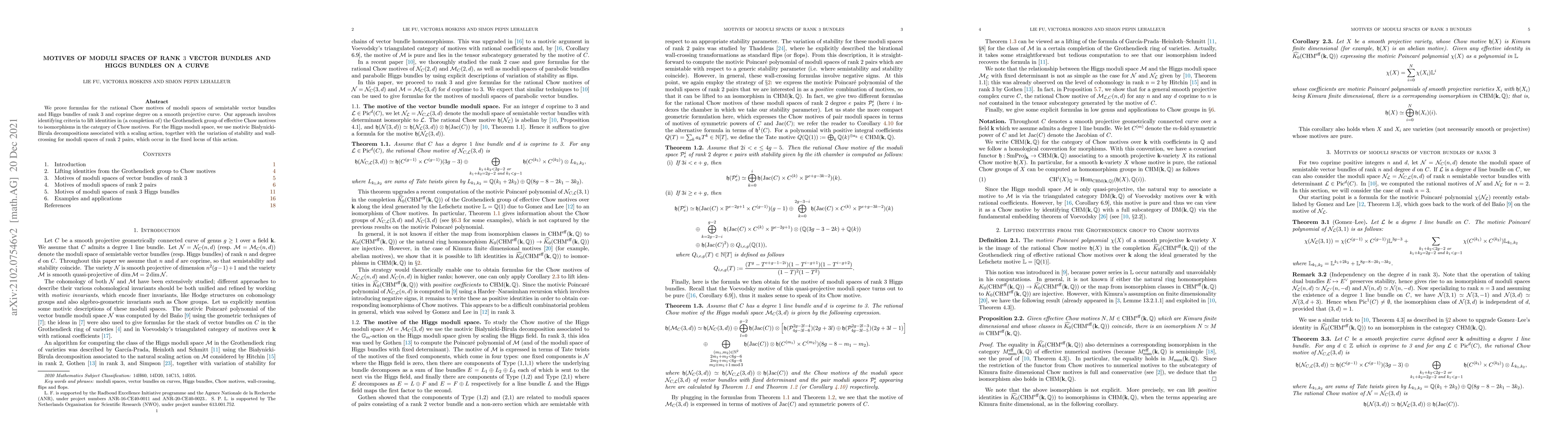 This paper establishes formulas for the rational Chow motives of moduli spaces of rank 3 vector bundles and Higgs bundles on a smooth projective curve. The authors achieve this by lifting identities in the Grothendieck group to Chow motives and utilize motivic Bialynicki-Birula decompositions for the Higgs moduli space.