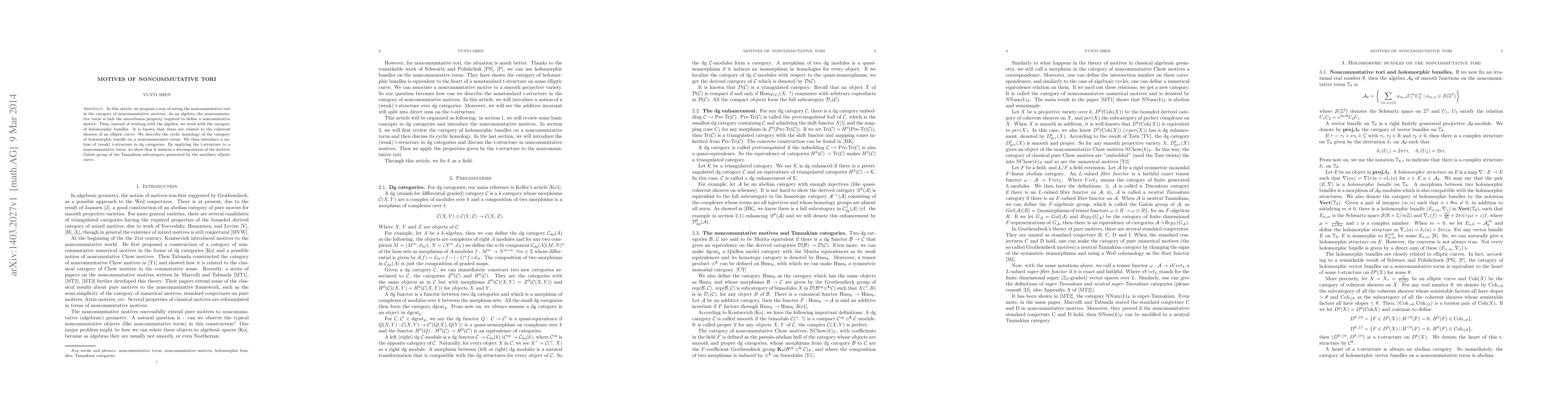 In this article, we propose a way of seeing the noncommutative tori in the category of noncommutative motives. As an algebra, the noncommutative torus is lack the smoothness property required to define a noncomutative motive. Thus, instead of working with the algebra, we work with the category of holomorphic bundles. It is known that these are related to the coherent sheaves of an elliptic curve. We describe the cyclic homology of the category of holomorphic bundle on a noncommutative torus. We then introduce a notion of (weak) t-structure in dg categories. By applying the t-structure to a noncommutative torus, we show that it induces a decomposition of the motivic Galois group of the Tannakian subcategory generated by the auxiliary elliptic curve.