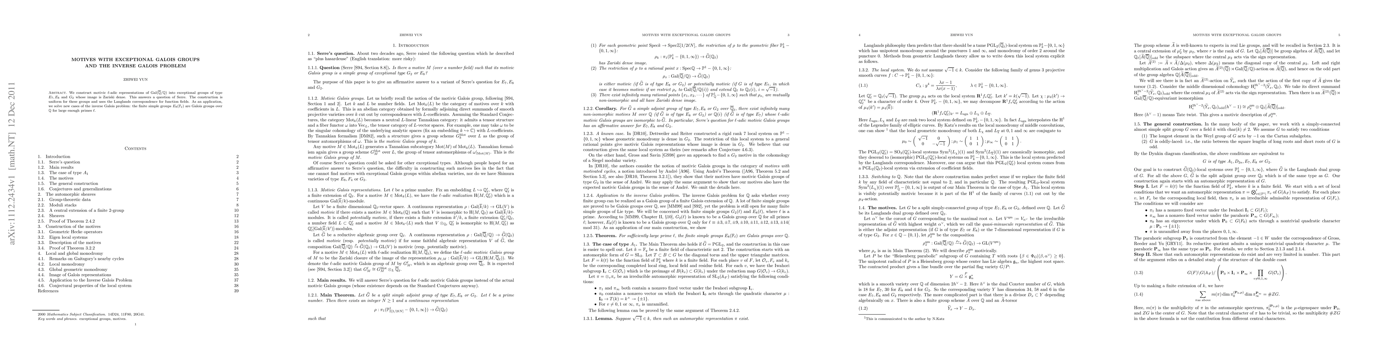 This paper constructs motivic $\ell$-adic representations into exceptional groups $E_7, E_8$, and $G_2$ with Zariski dense images, addressing a question by Serre. It uses the Langlands correspondence for function fields and resolves new cases of the inverse Galois problem, showing $E_8(\FF_{\ell})$ as Galois groups over $\QQ$ for sufficiently large primes $\ell$.