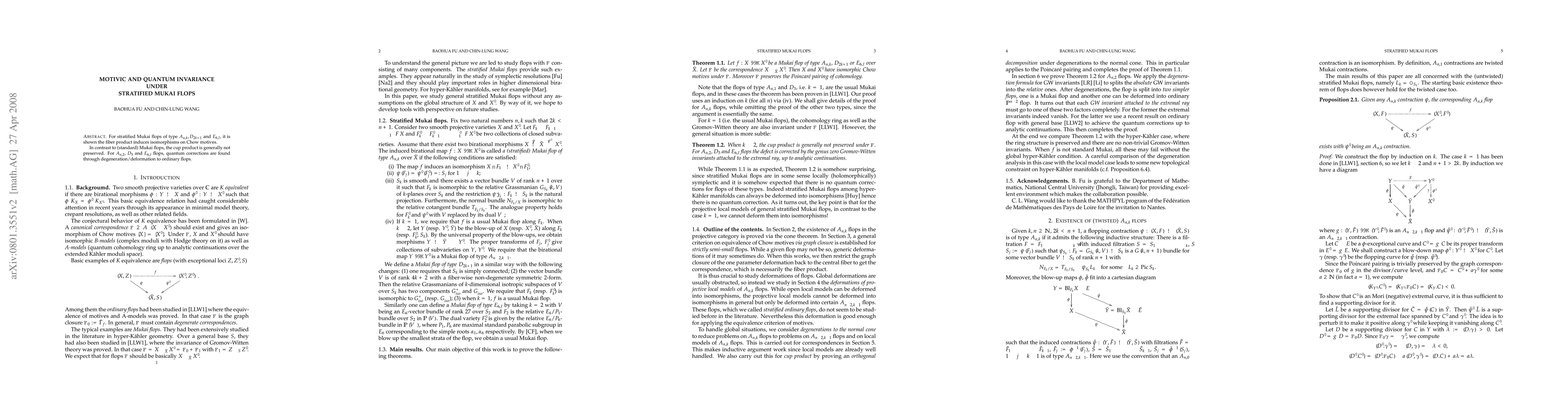 This paper demonstrates that stratified Mukai flops of types $A_{n,k}, D_{2k+1}$, and $E_{6,I}$ induce isomorphisms on Chow motives, unlike standard Mukai flops where the cup product is typically not preserved. Quantum corrections are identified for $A_{n,2}$, $D_5$, and $E_{6,I}$ flops via degeneration to ordinary flops.