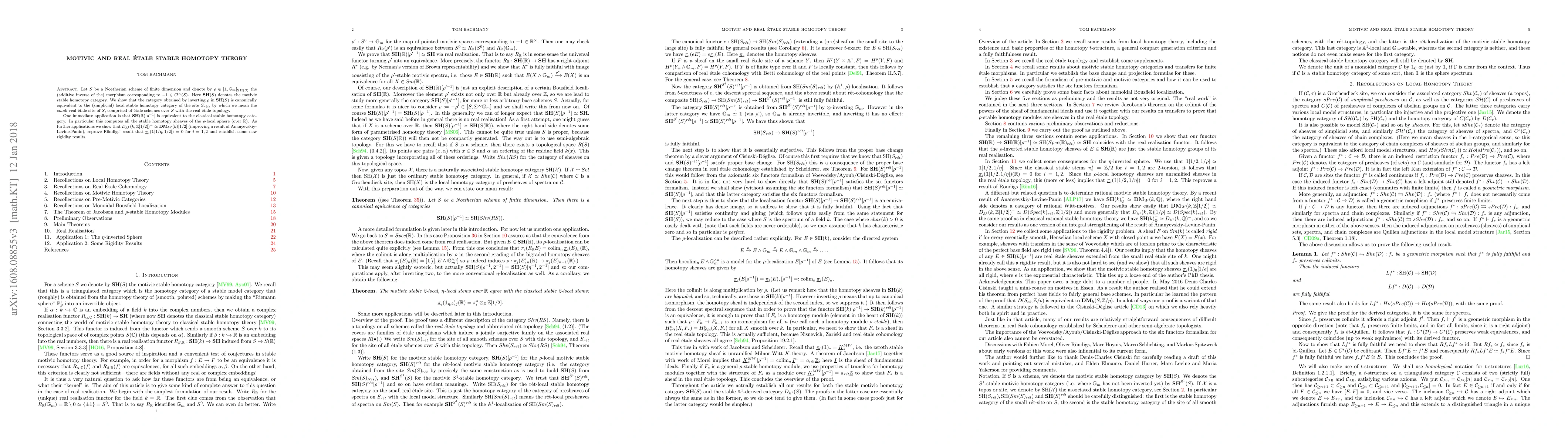 The paper establishes an equivalence between the motivic stable homotopy category, inverted by a specific morphism, and the local stable homotopy category of the real étale site of a Noetherian scheme. This equivalence extends to compute stable homotopy sheaves of the rho-local sphere over real numbers and yields further rigidity results.
