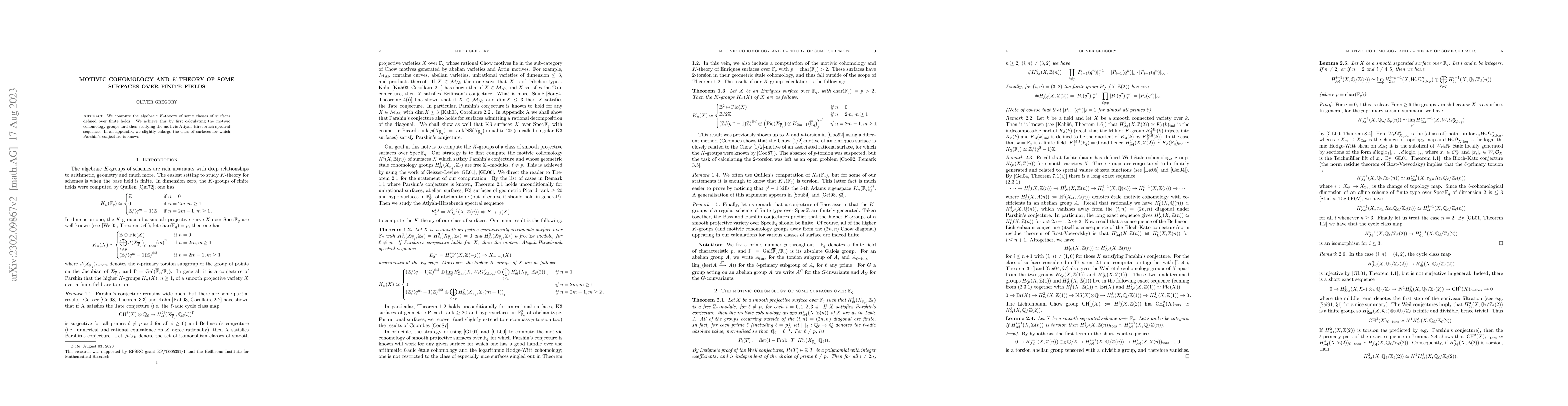 This paper calculates the algebraic $K$-theory for specific surfaces over finite fields by first determining their motivic cohomology groups and utilizing the motivic Atiyah-Hirzebruch spectral sequence. An appendix extends the scope of surfaces for which Parshin's conjecture holds.