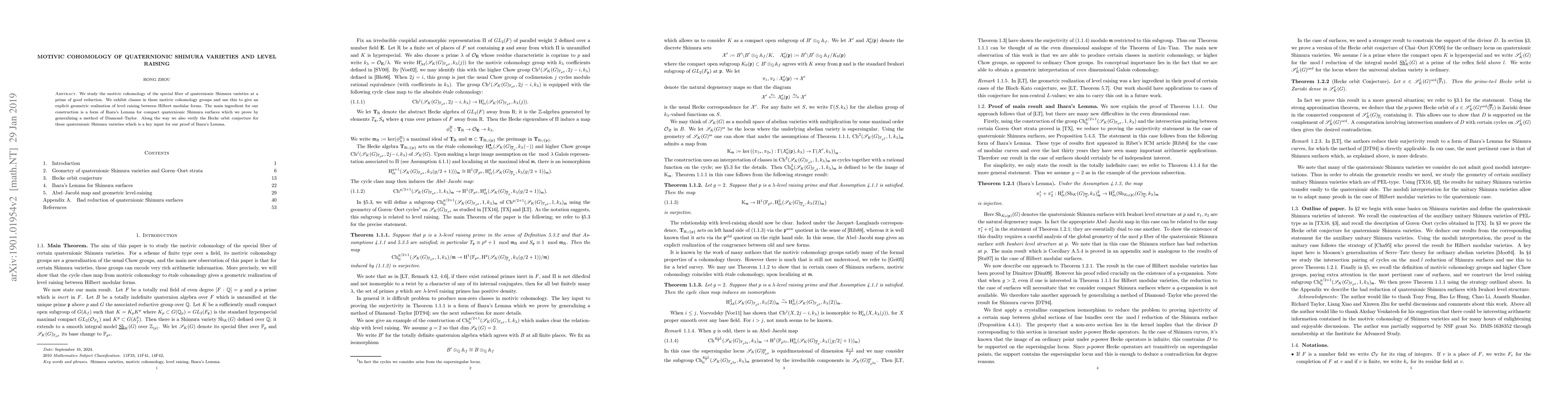 This paper investigates the motivic cohomology of the special fiber of quaternionic Shimura varieties, providing explicit classes and demonstrating a geometric realization of level raising for Hilbert modular forms. It leverages a generalized version of Ihara's Lemma and verifies the Hecke orbit conjecture as a crucial step in the proof.
