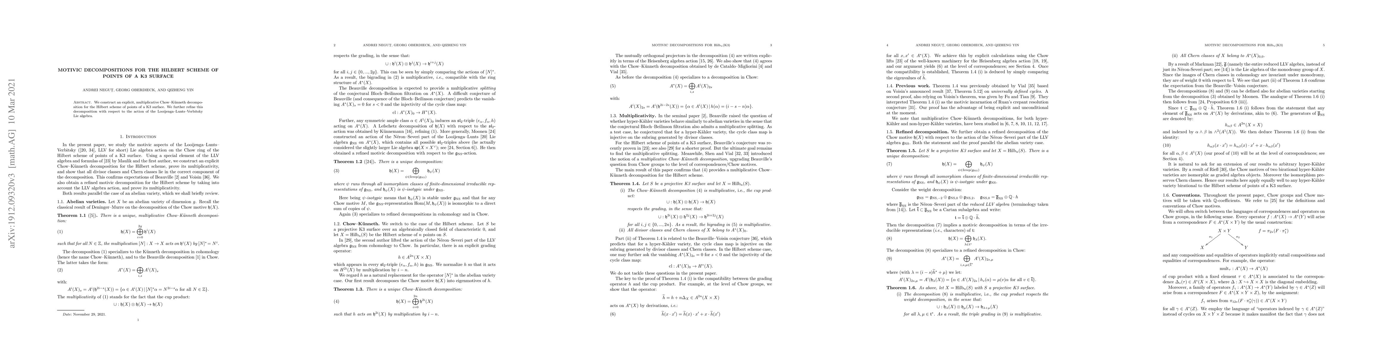 Summary: This paper constructs a multiplicative Chow-Künneth decomposition for the Hilbert scheme of points on a K3 surface and refines it using the Looijenga-Lunts-Verbitsky Lie algebra to enhance the understanding of its motivic structure.