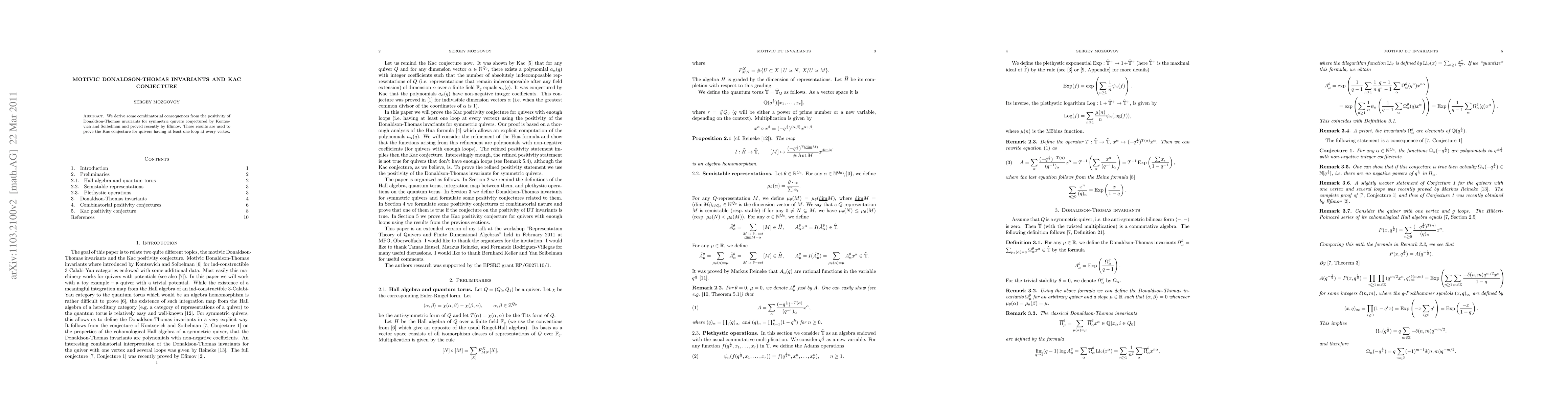 The paper derives combinatorial consequences from the positivity of Donaldson-Thomas invariants for symmetric quivers, which helps in proving the Kac conjecture for quivers with loops at every vertex.