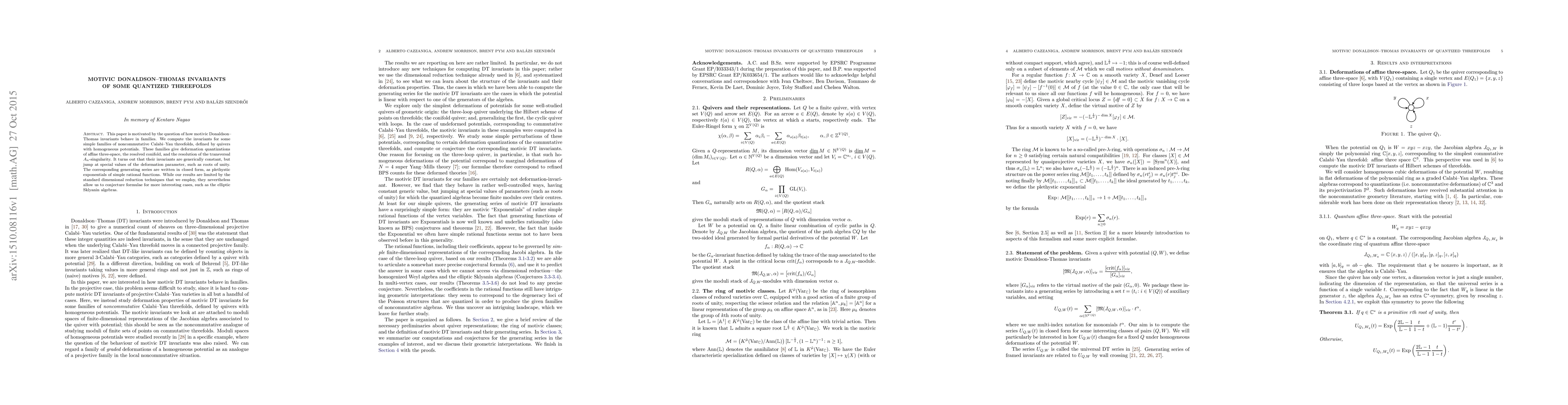 This paper is motivated by the question of how motivic Donaldson--Thomas invariants behave in families. We compute the invariants for some simple families of noncommutative Calabi--Yau threefolds, defined by quivers with homogeneous potentials. These families give deformation quantizations of affine three-space, the resolved conifold, and the resolution of the transversal $A_n$-singularity. It turns out that their invariants are generically constant, but jump at special values of the deformation parameter, such as roots of unity. The corresponding generating series are written in closed form, as plethystic exponentials of simple rational functions. While our results are limited by the standard dimensional reduction techniques that we employ, they nevertheless allow us to conjecture formulae for more interesting cases, such as the elliptic Sklyanin algebras.