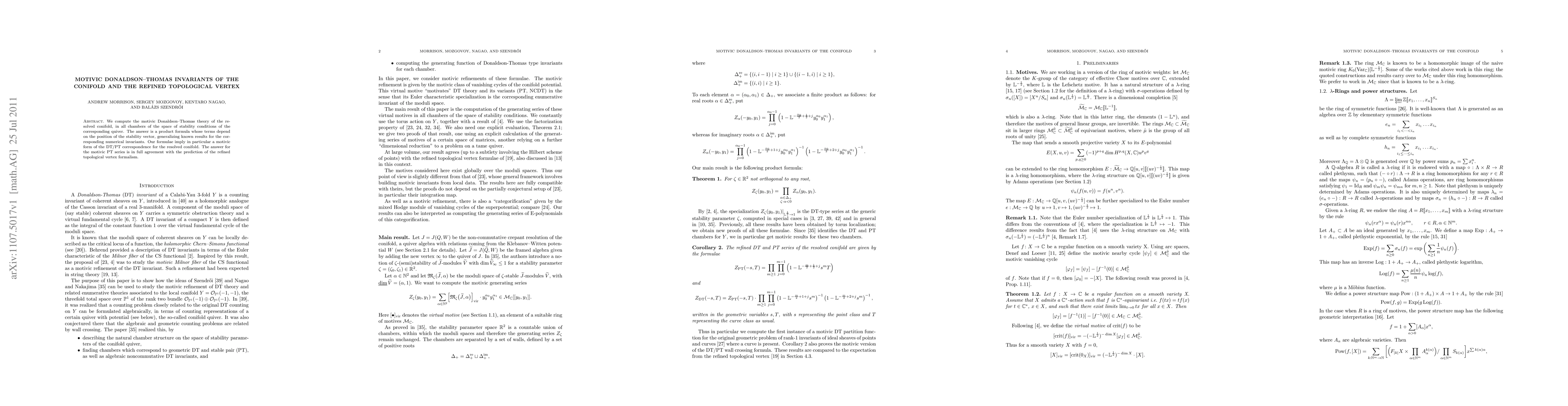 This paper computes the motivic Donaldson-Thomas invariants for the resolved conifold across various stability conditions, revealing a product formula that generalizes known numerical invariants. The results support a motivic version of the DT/PT correspondence and align with predictions from the refined topological vertex formalism.
