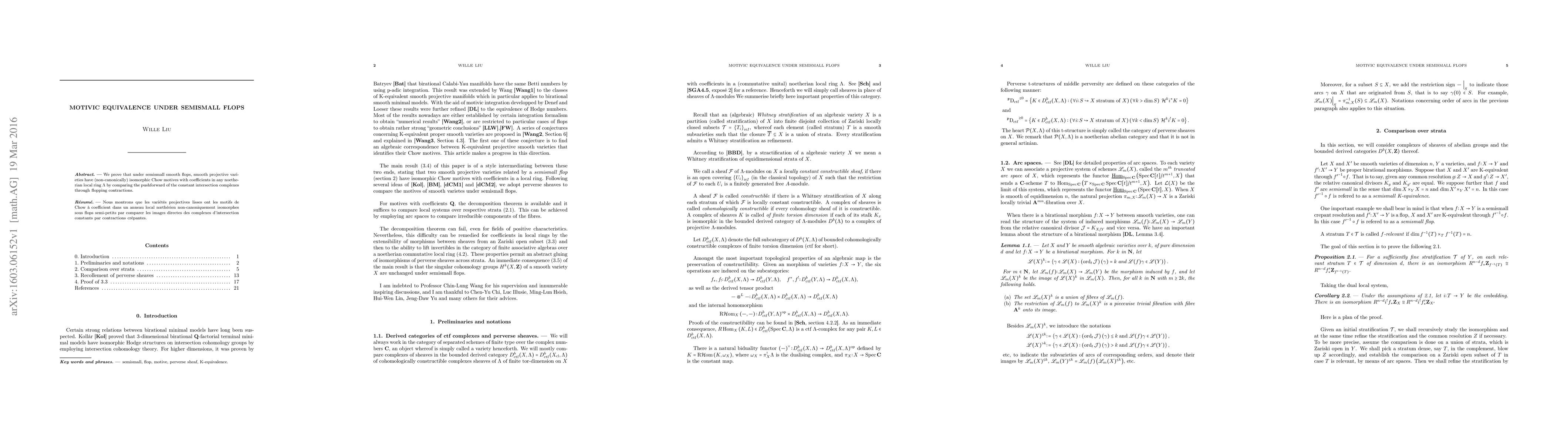 We prove that under semismall smooth flops, smooth projective varieties have (non-canonically) isomorphic Chow motives with coefficients in any noetherian local ring $\Lambda$ by comparing the pushforward of the constant intersection complexes through flopping contractions.