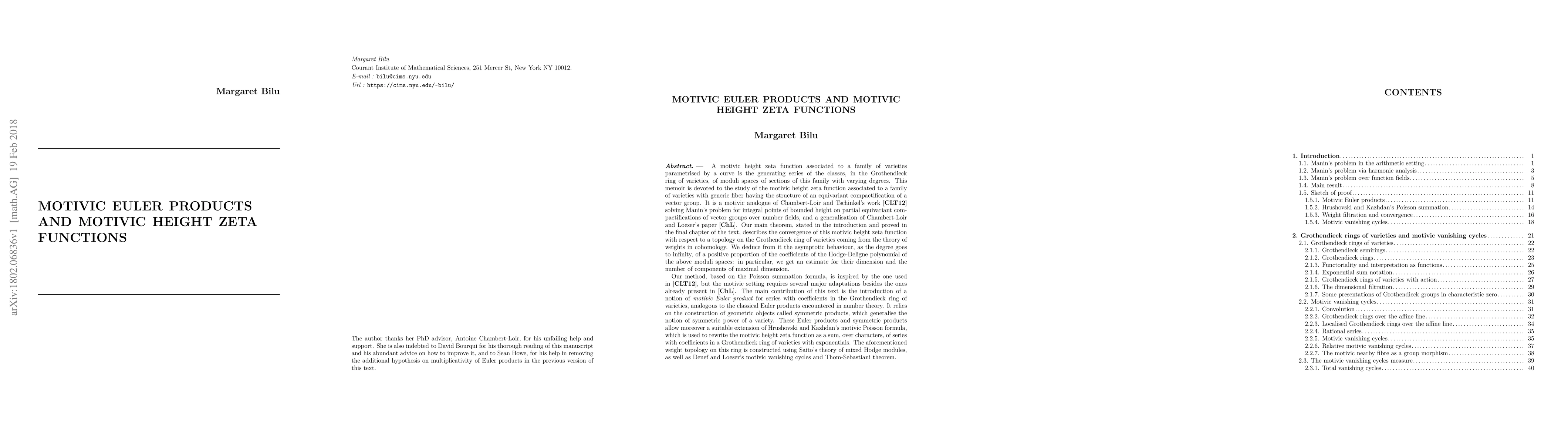 A motivic height zeta function associated to a family of varieties parametrised by a curve is the generating series of the classes, in the Grothendieck ring of varieties, of moduli spaces of sections of this family with varying degrees. This text is devoted to the study of the motivic height zeta function associated to a family of varieties with generic fiber having the structure of an equivariant compactification of a vector group. Our main theorem describes the convergence of this motivic height zeta function with respect to a topology on the Grothendieck ring of varieties coming from the theory of weights in cohomology. We deduce from it the asymptotic behaviour, as the degree goes to infinity, of a positive proportion of the coefficients of the Hodge-Deligne polynomial of the above moduli spaces: in particular, we get an estimate for their dimension and the number of components of maximal dimension. The main tools for this are a notion of motivic Euler product for series with coefficients in the Grothendieck ring of varieties, an extension of Hrushovski and Kazhdan's motivic Poisson summation formula, and a motivic measure on the Grothendieck ring of varieties with exponentials constructed using Denef and Loeser's motivic vanishing cycles.