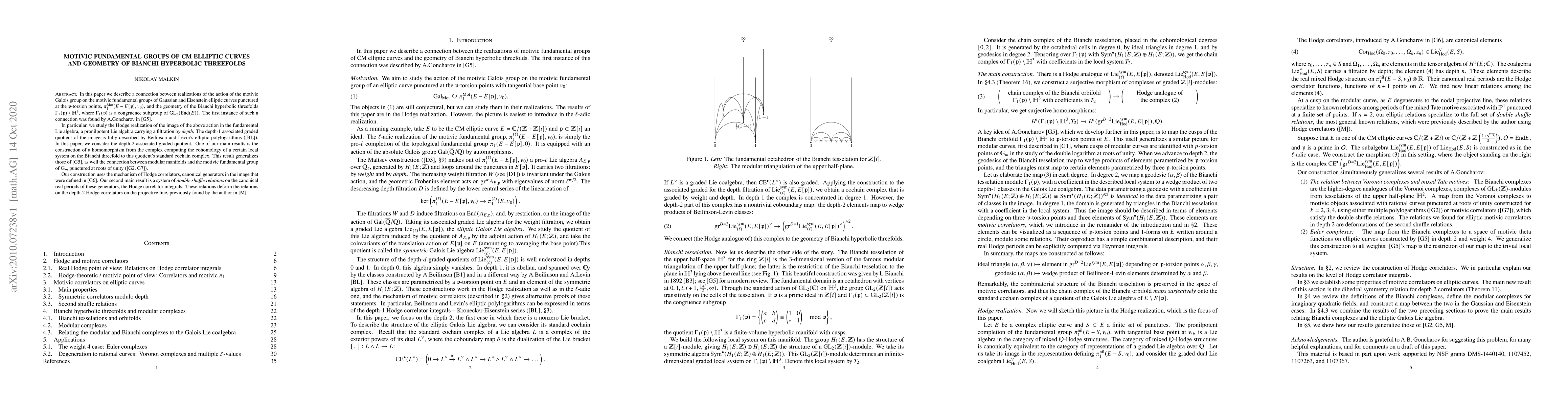In this paper we describe a connection between realizations of the action of the motivic Galois group on the motivic fundamental groups of Gaussian and Eisenstein elliptic curves punctured at the $\mathfrak{p}$-torsion points, $\pi_1^{\rm Mot}(E-E[\mathfrak{p}],v_0)$, and the geometry of the Bianchi hyperbolic threefolds $\Gamma_1(\mathfrak{p})\setminus\mathbb{H}^3$, where $\Gamma_1(\mathfrak{p})$ is a congruence subgroup of ${\rm GL}_2({\rm End}(E))$. The first instance of such a connection was found by A.Goncharov (arXiv:math/0510310). In particular, we study the Hodge realization of the image of the above action in the fundamental Lie algebra, a pronilpotent Lie algebra carrying a filtration by depth. The depth-1 associated graded quotient of the image is fully described by Beilinson and Levin's elliptic polylogarithms. In this paper, we consider the depth-2 associated graded quotient. One of our main results is the construction of a homomorphism from the complex computing the cohomology of a certain local system on the Bianchi threefold to this quotient's standard cochain complex. This result generalizes those of Goncharov, as well the connection between modular manifolds and the motivic fundamental group of $\mathbb{G}_m$ punctured at roots of unity (arXiv:1105.2076, arXiv:1910.10321). Our construction uses the mechanism of Hodge correlators, canonical generators in the image that were defined in arXiv:0803.0297. Our second main result is a system of double shuffle relations on the canonical real periods of these generators, the Hodge correlator integrals. These relations deform the relations on the depth-2 Hodge correlators on the projective line, previously found by the author (arXiv:2003.06521).