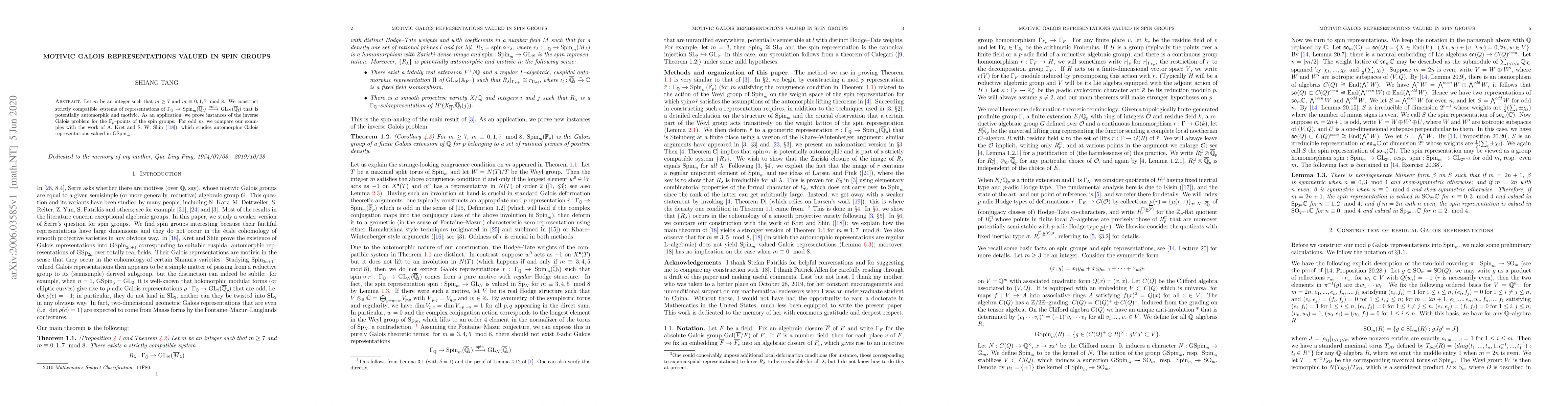 This paper constructs compatible systems of Galois representations valued in Spin groups, showing they are potentially automorphic and motivic. It also addresses the inverse Galois problem for $\mathbb{F}_p$-points of spin groups and compares results for odd $m$ with prior work on automorphic Galois representations.